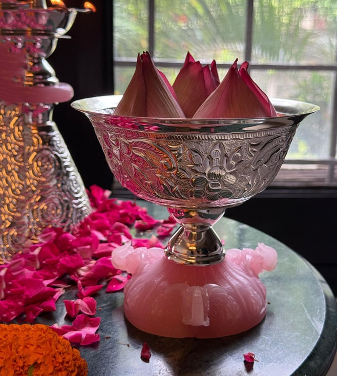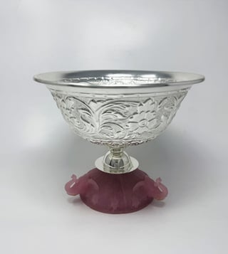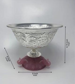 Bring timeless elegance to your home with this beautifully handcrafted Traditional Elephant Silver-Plated Bowl. The bowl is meticulously made from premium brass with silver-plated finish, featuring intricate floral and motif engravings. Its base is designed from pink resin, adorned with traditional elephant figures that symbolize strength, wisdom, and prosperity.Perfect for festive decor, pooja rituals, or as a statement centerpiece, this bowl blends cultural artistry with modern sophistication.