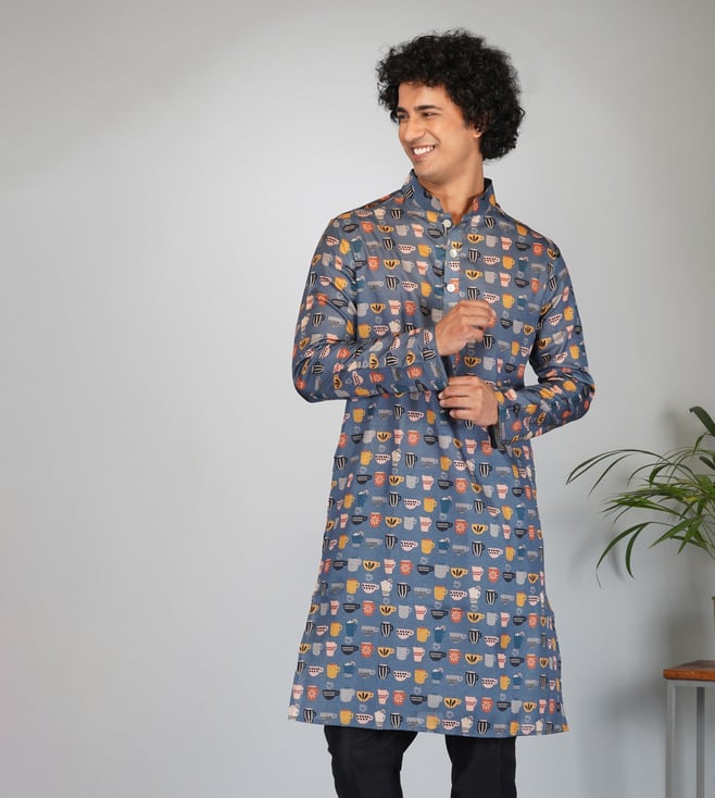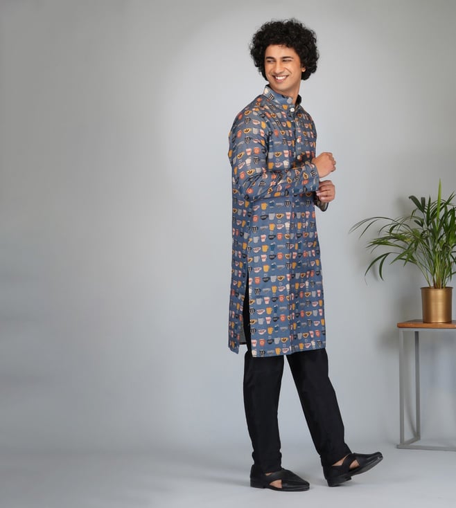Eleven Brothers Blue Naqqaash Tea'O Clock Tussar Silk Kurta with Plain Black Pant