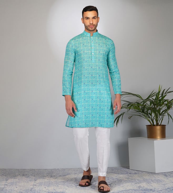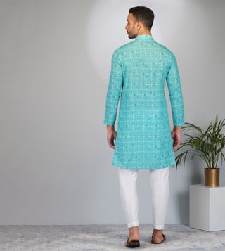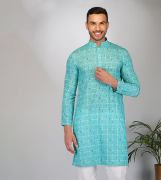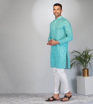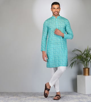 This handcrafted playful printed kurta with pants is a fresh take on ethnic wear. This designer kurta with a minimalist yet rich look comes with two side slits and two pockets. It has been combined with clean lines and mother-of-pearl buttons. The kurta has been crafted with care using softy silk. The pants have been made of cotton silk. This garment is from the Foret De Fete collection. Disclaimer: Product colour may slightly vary due to photographic lighting sources. Country of Origin - India.