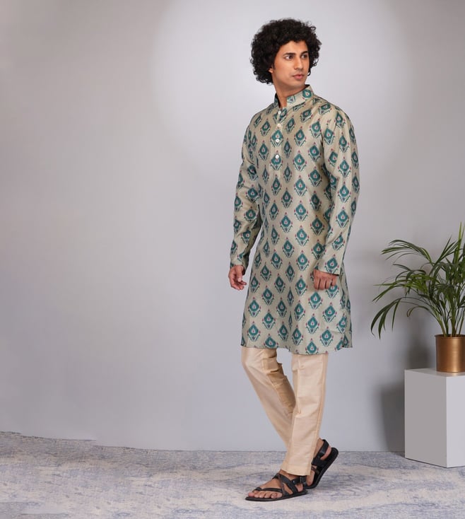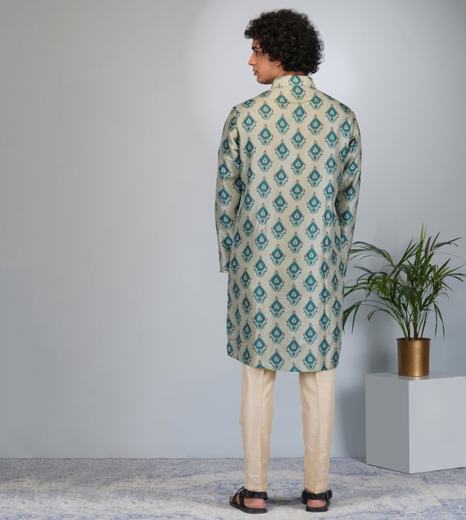 Eleven Brothers Green Naqqaash Leafy Emerald Mulberry Silk Kurta with Beige Ankle Lenth Pants