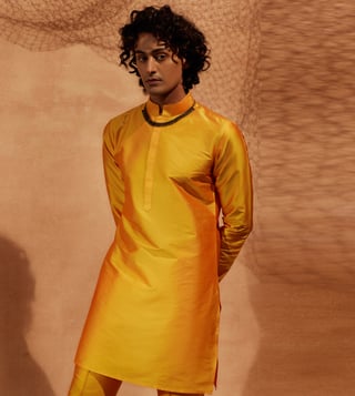 This handcrafted playful printed silk kurta is a fresh take on men's ethnic wear. This designer kurta with a minimalist yet rich look comes in a regular fit with two side slits and two pockets. Made of lightweight & breathable premium silk fabric combined with clean lines, vibrant hues and mother of pearl buttons.