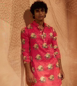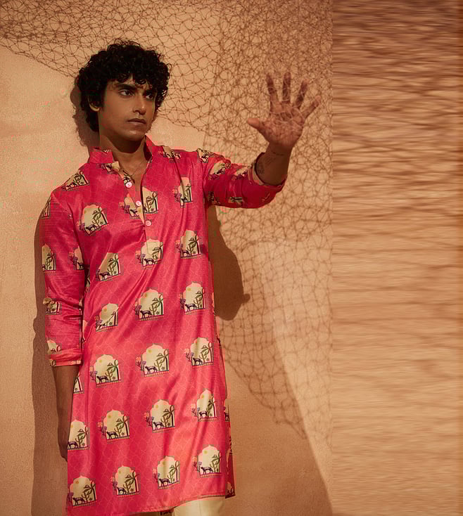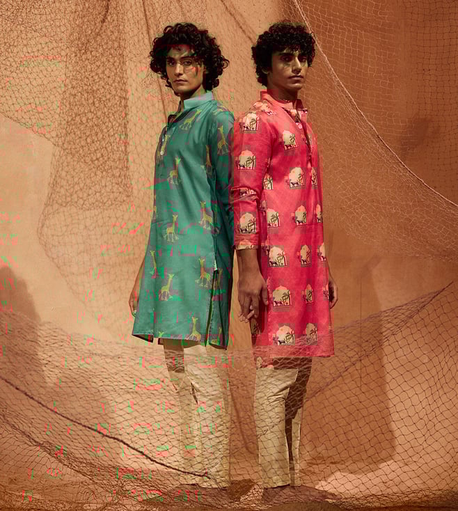 This handcrafted playful printed silk kurta is a fresh take on men's ethnic wear. This designer kurta with a minimalist yet rich look comes in a regular fit with two side slits and two pockets. Made of lightweight & breathable premium silk fabric combined with clean lines, vibrant hues and mother of pearl buttons.