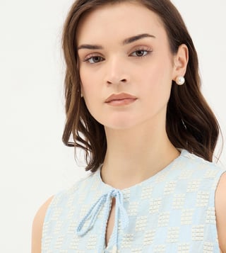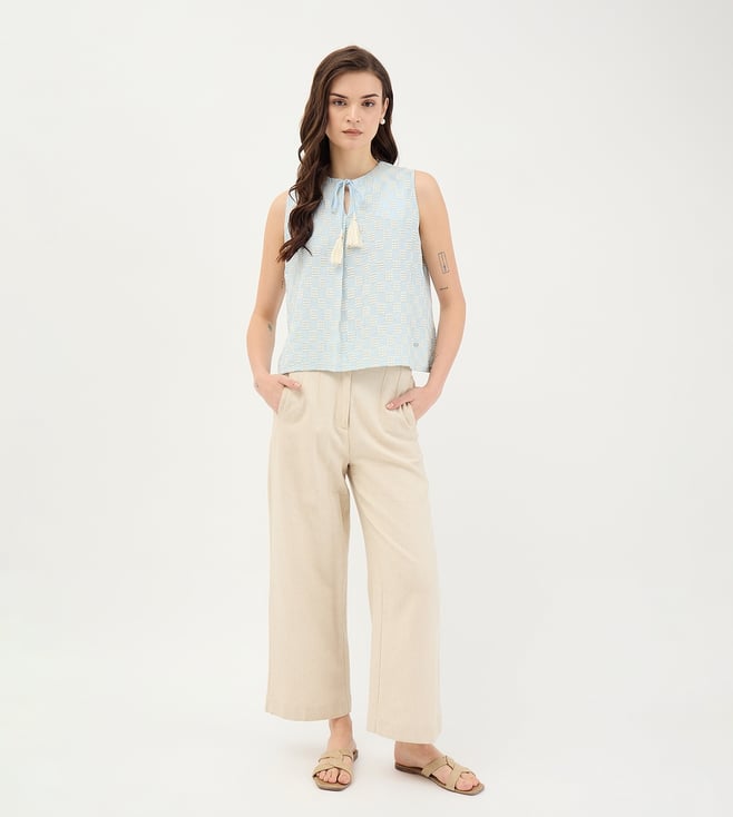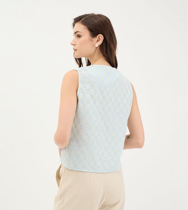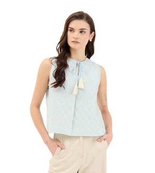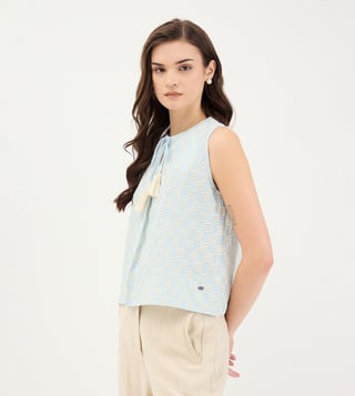 Discover effortless style with our blue sleeveless top, featuring a relaxed embroidered pattern that adds a touch of elegance to your wardrobe. Crafted from high-quality polyester fabric, this top ensures comfort and durability for all-day wear. The tie-ups neck and closure offer a customizable fit, allowing you to adjust the neckline to your preference. Perfect for casual outings or a day at the office, this versatile piece pairs beautifully with jeans or skirts. Elevate your fashion game with this chic and timeless addition to your collection.