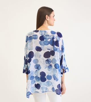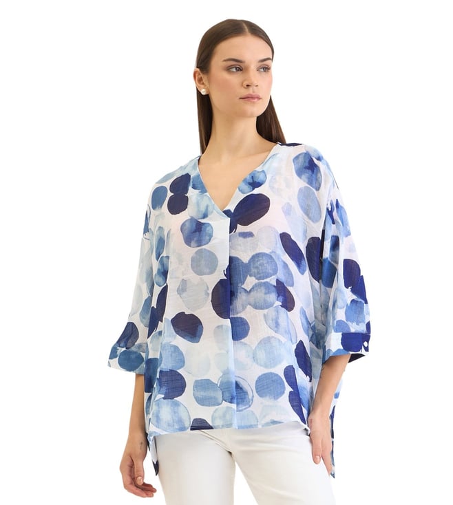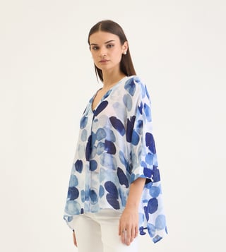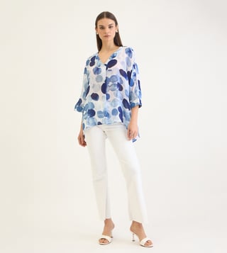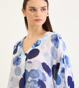 Discover effortless style with our blue abstract pattern top, designed for the modern woman who values both comfort and elegance. Crafted from soft viscose fabric, this top features a relaxed fit that drapes beautifully over your silhouette. The high low hemline adds a contemporary twist, while the side slits offer ease of movement. A chic V-neckline with a subtle hook closure enhances its sophisticated appeal, and the 3/4th sleeves provide just the right amount of coverage.