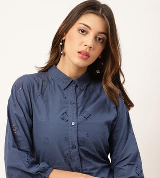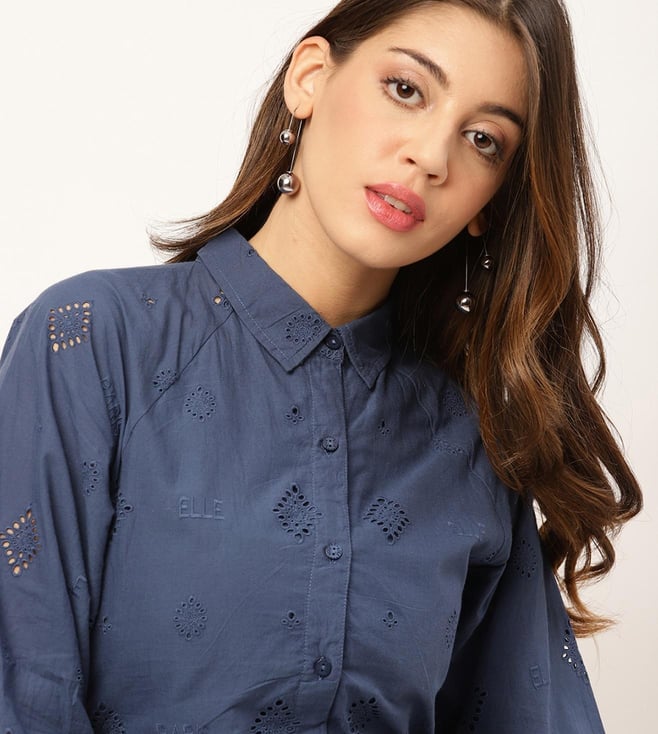 Elevate your wardrobe with our stunning blue cutout detail dress, a perfect blend of elegance and comfort. Crafted from pure cotton, this semi-fitted dress features an exquisite embroidered pattern that adds a touch of sophistication. The elbow-length raglan sleeves offer a modern twist, while the spread collar enhances its chic appeal. Designed with a convenient button closure, this dress is as functional as it is fashionable. Ideal for any occasion, it promises to be a versatile staple in your collection.