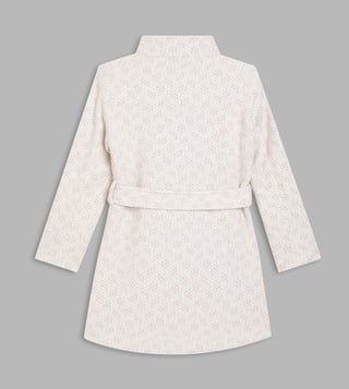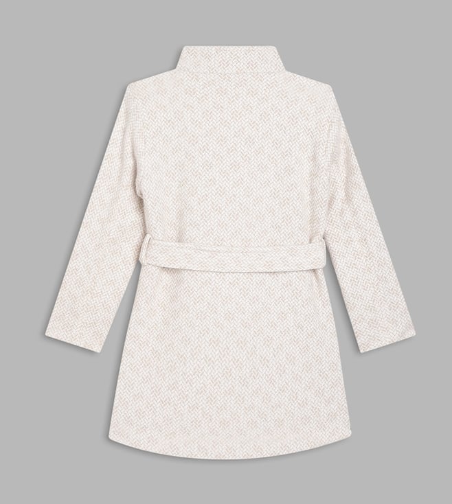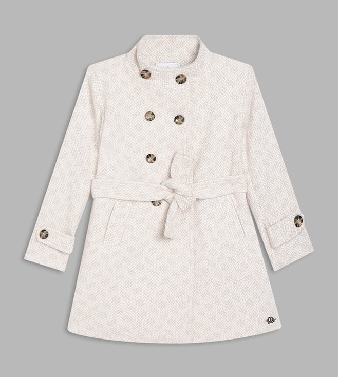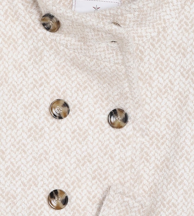 A chic and cozy beige overcoat for girls, featuring a textured pattern, full sleeves, and a mock neck. The regular fit and button closure offer a flattering and comfortable style. Crafted from soft polyester fabric, perfect for layering in any season.