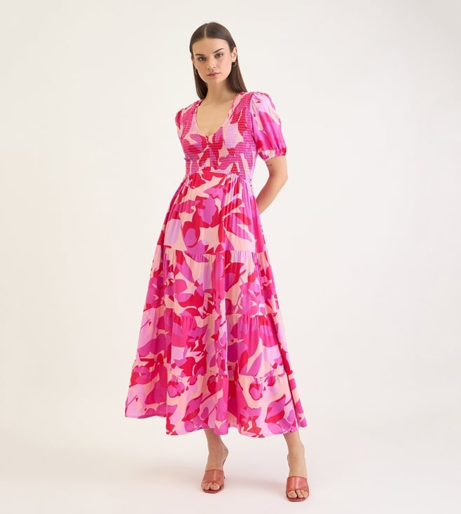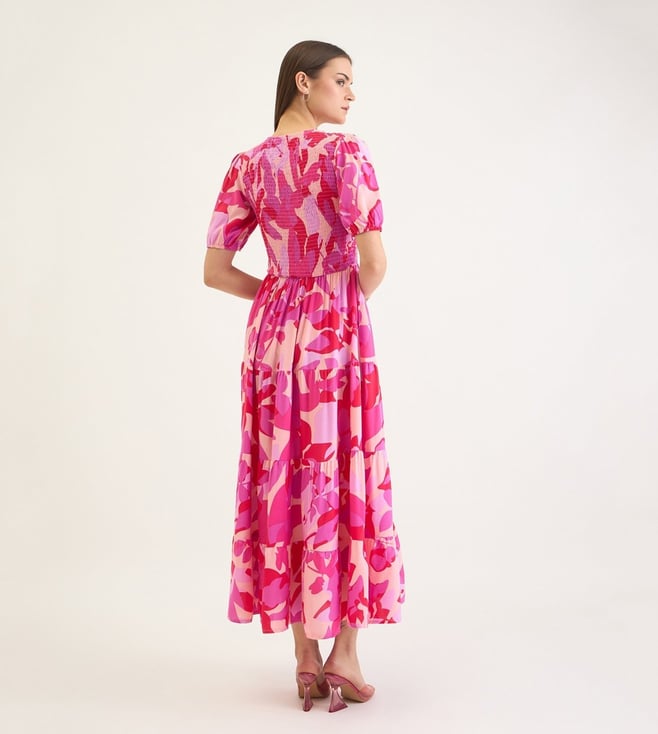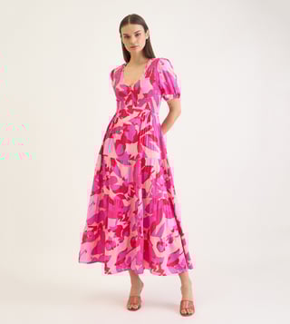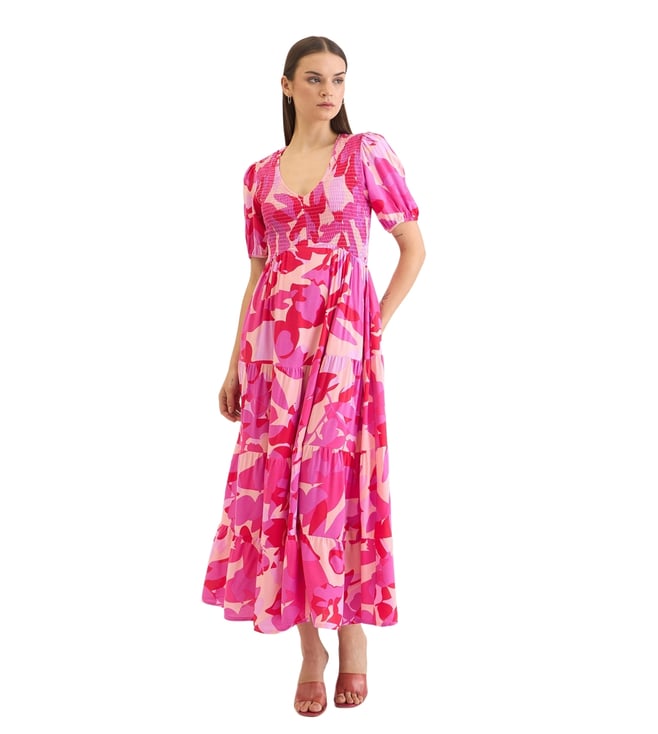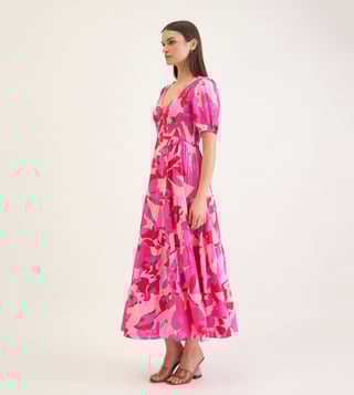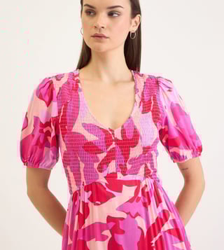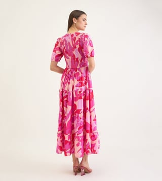 Discover the perfect blend of style and comfort with our pink tiered dress, designed to make a statement. This fit and flare dress features an eye-catching abstract pattern that adds a modern twist to your wardrobe. Crafted from soft viscose fabric, it ensures a lightweight feel for all-day wear. The short sleeves and v-neckline offer a flattering silhouette, while the convenient zipper closure at the back provides ease of wear. Ideal for any occasion, this all-over printed dress effortlessly transitions from day to night, making it a versatile addition to your collection.