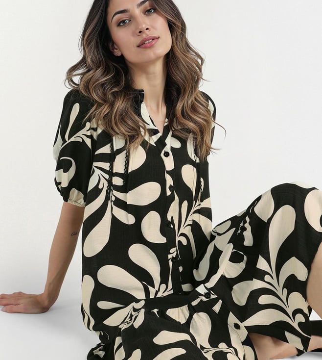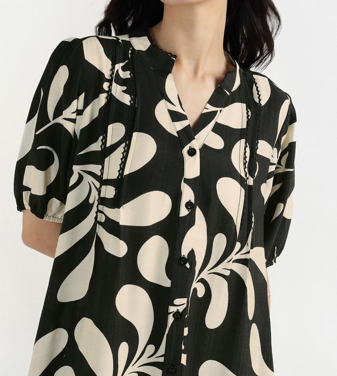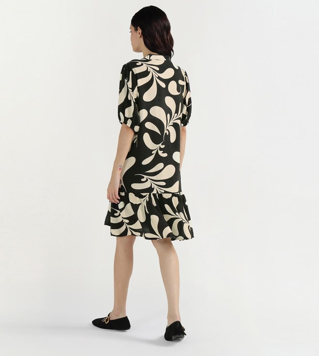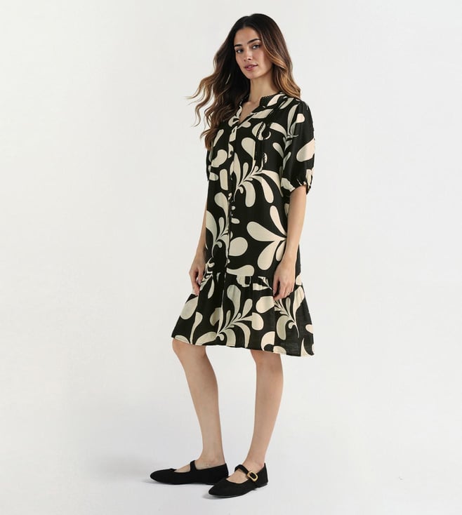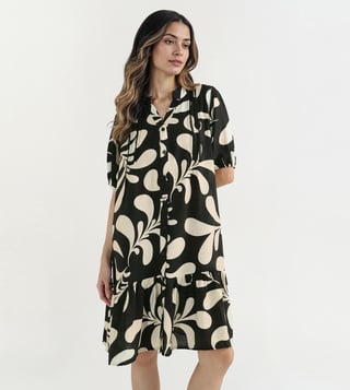 A v-neckline with button closure gives this dress a simple yet stylish look. Made up of pure viscose makes it soft and breathable for casual wear. Relaxed fit with half sleeves ensures ease of movement. Black and white base with all-over print follows the current trend. Knee length cut keeps it versatile for day outings or evening casual plans.