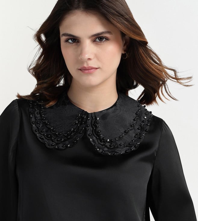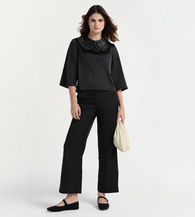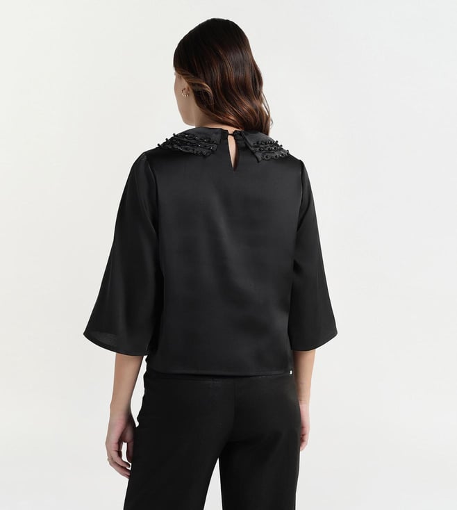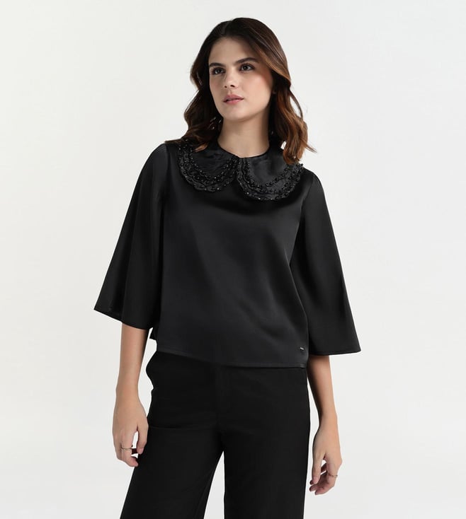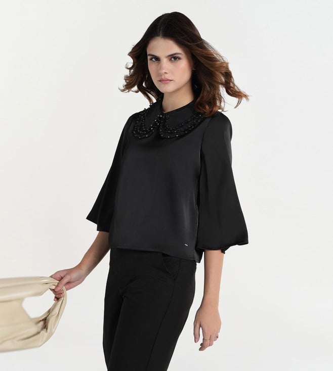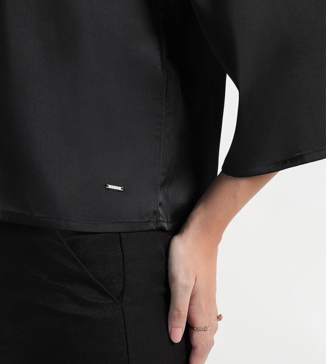 Made in polyester this black top is detailed with front studding. Its round neck and bell sleeves add balance while the 3/4th sleeves give it a polished yet trendy look for the season.