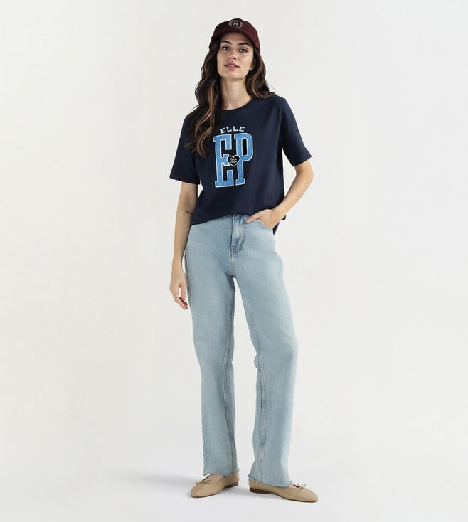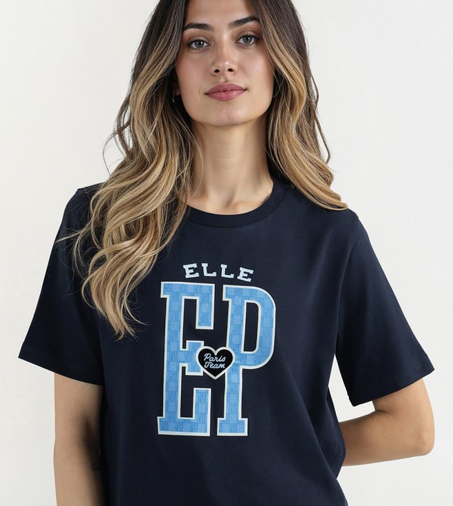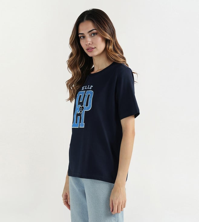 Elle Women Blue Graphic Print Crew Neck Pure Cotton T-Shirt