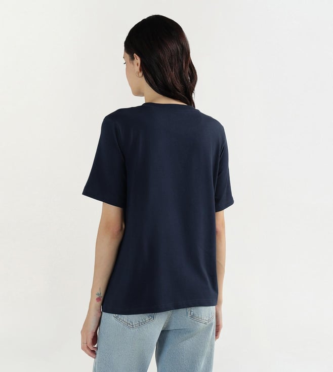 Soft cotton fabric makes this tee easy to wear through the day. The relaxed fit with crew neck and half sleeves keeps it simple and casual. A front branding graphic adds detail without overdoing it. The solid navy tone keeps it versatile and in step with the season’s trend, pairing well with jeans or joggers.