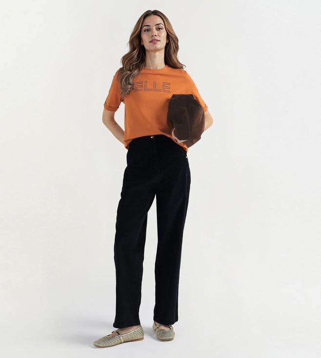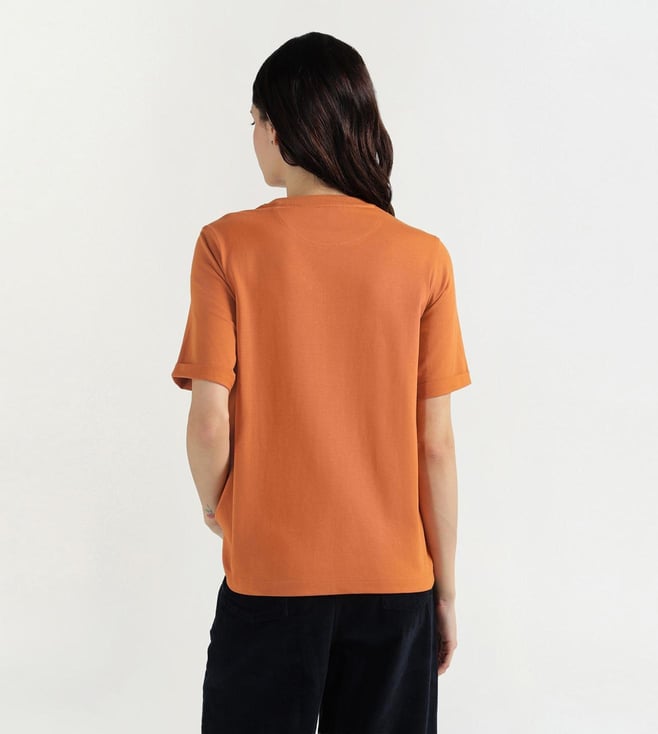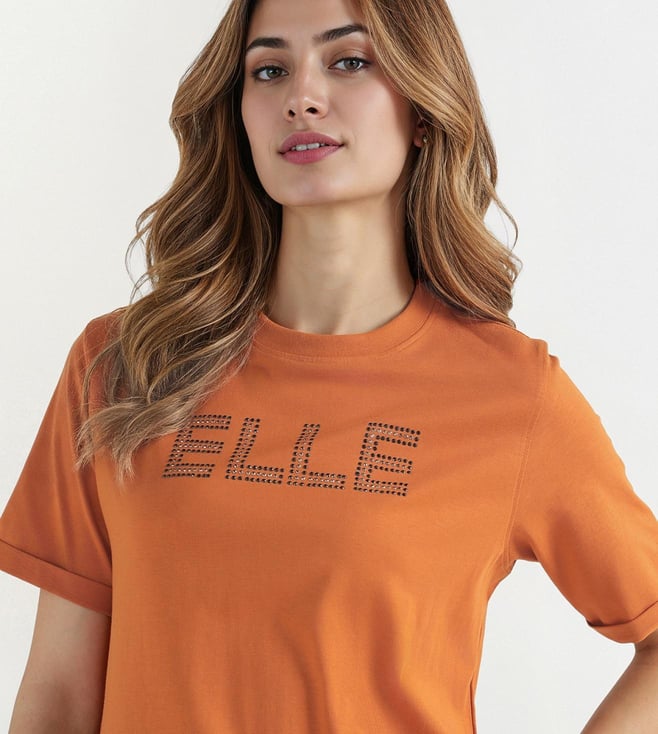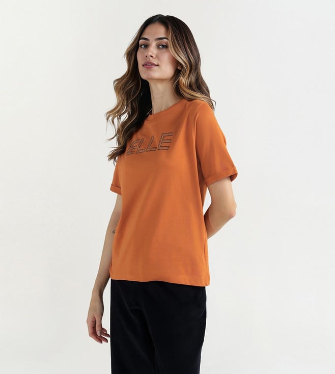 Crafted from pure cotton fabric this rust-colored t-shirt comes with stud detailing at the front. It features a crew neck and half sleeves. The stretchable fabric makes it perfect for casual everyday wear.