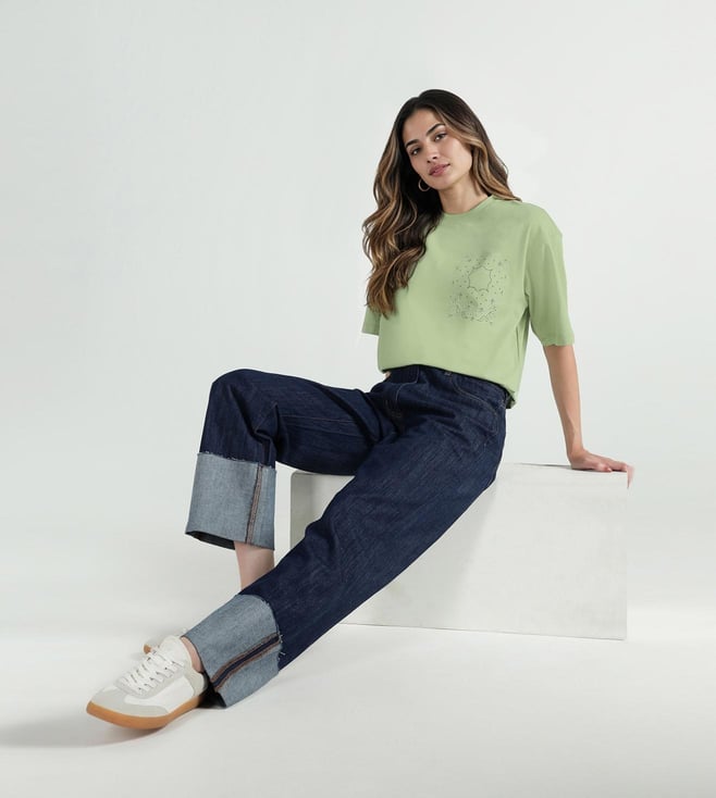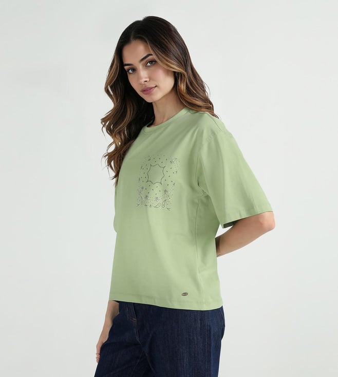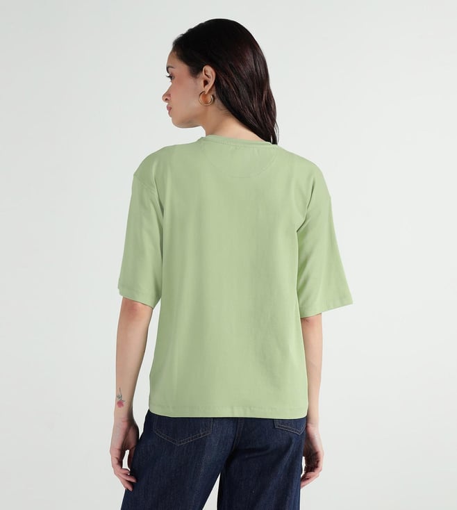 Elle Women Green Solid Round Neck Pure Cotton T-Shirt
