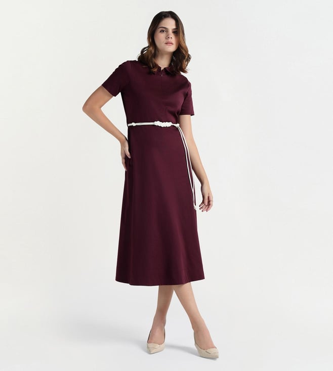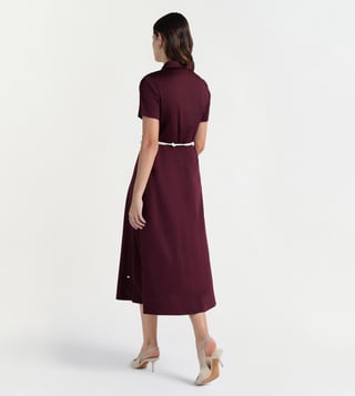 The collared neckline with half sleeves gives this wine dress a smart casual edge. Fabric blend of cotton and elastane feels soft with a slight stretch for comfort. Fit and flare style with calf length keeps it easy to wear. A front opening with zipper detail adds a modern touch while the solid color stays on trend.