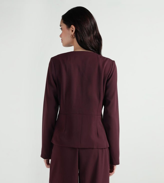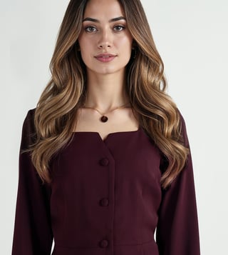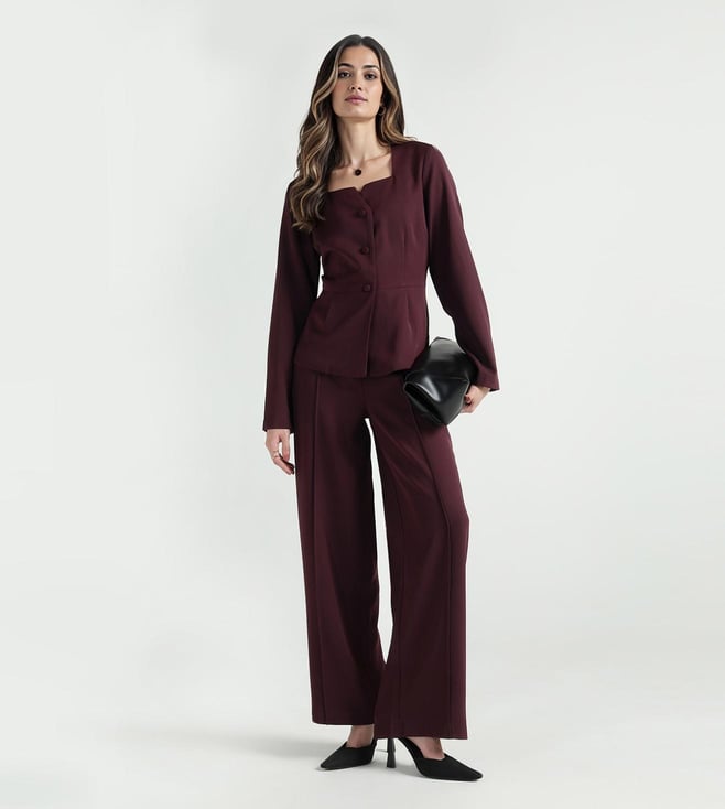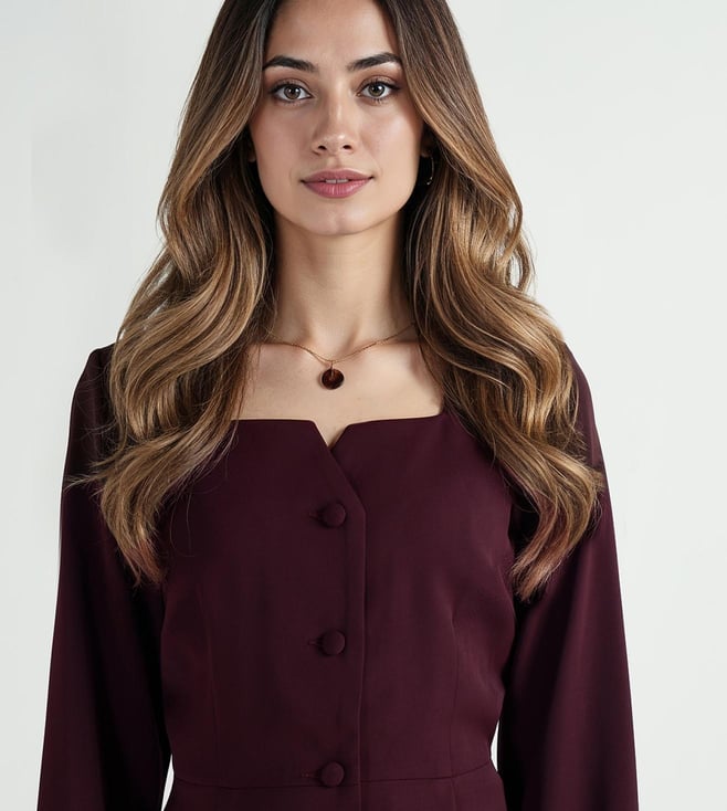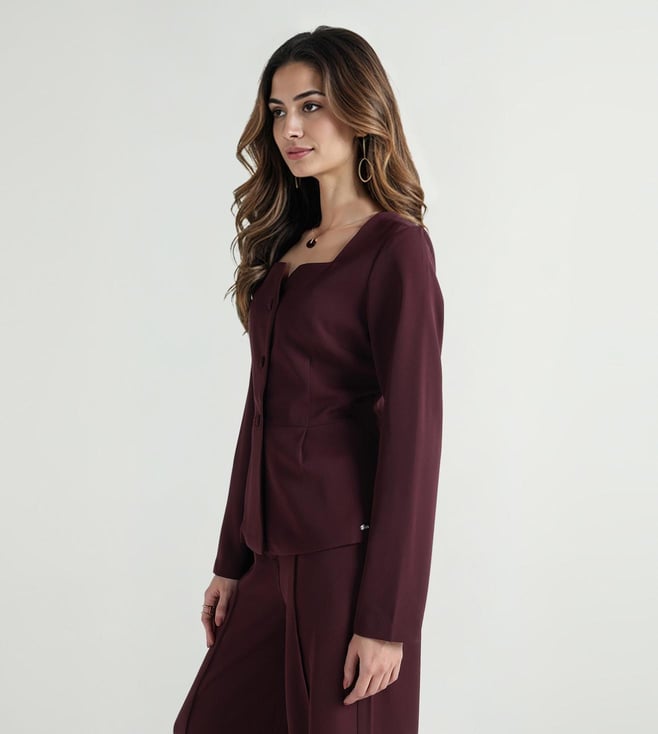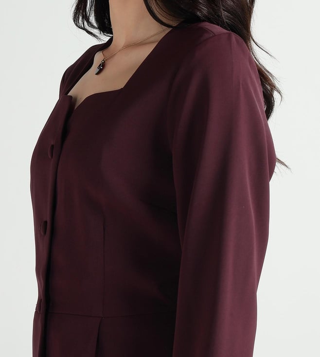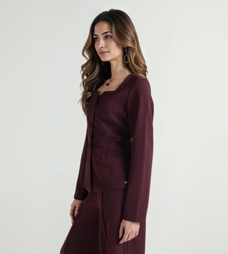 A party-ready wine top in cotton fabric that feels breathable yet structured. Designed with a square neckline and full sleeves it carries a fitted look with a flare finish. Front pleats & button closure add detail while keeping it polished. It's a stylish piece that pairs well with skirts or slim trousers.