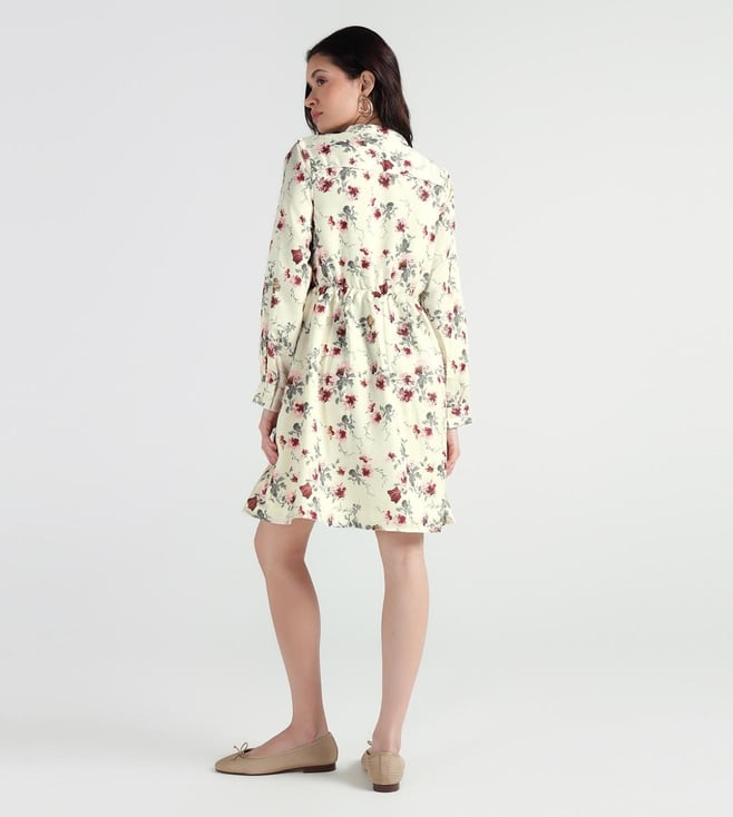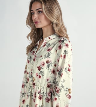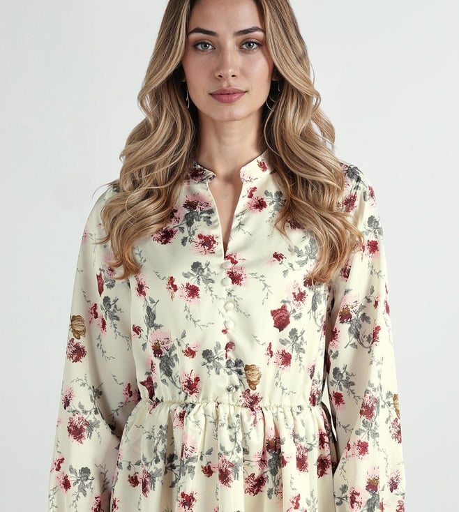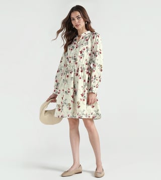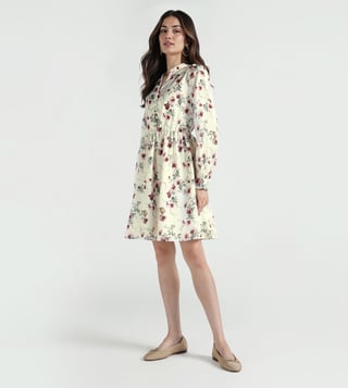 A mandarin collar with full front buttons gives this dress a smart finish. Crafted out of cotton fabric make it feel light and breathable. Fit and flare cut with knee length keeps the shape balanced for casual outings. Full sleeves add coverage while the floral print follows the fashion trend. Easy pick for day-to-day wear.