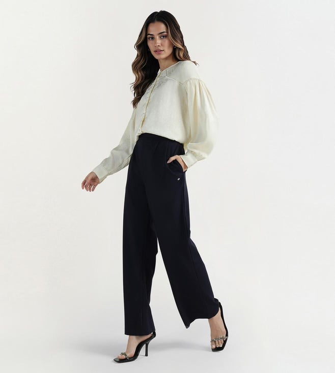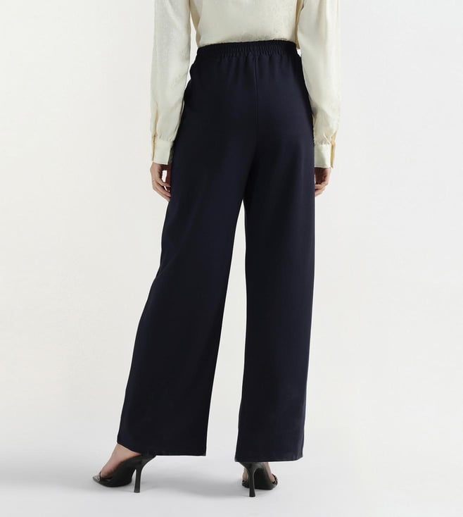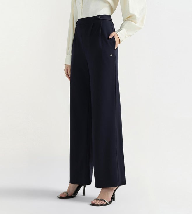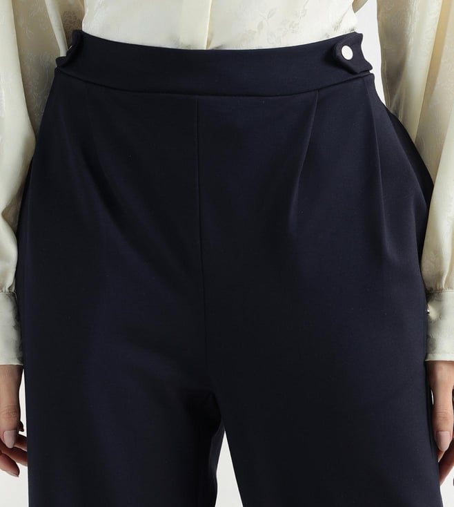 Made from soft polyester with added spandex, these navy pants feature front pleats for a sharp touch. A mid-rise waist and fly zipper design make them versatile for everyday outfits while staying comfortable.