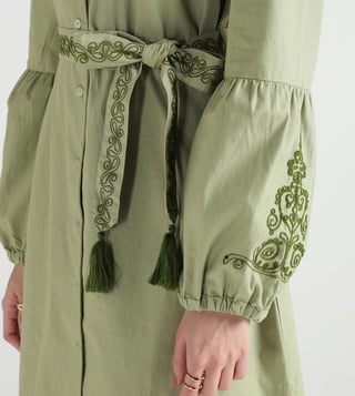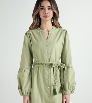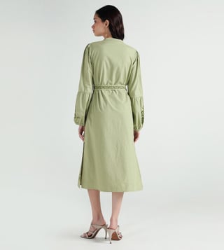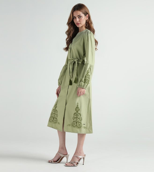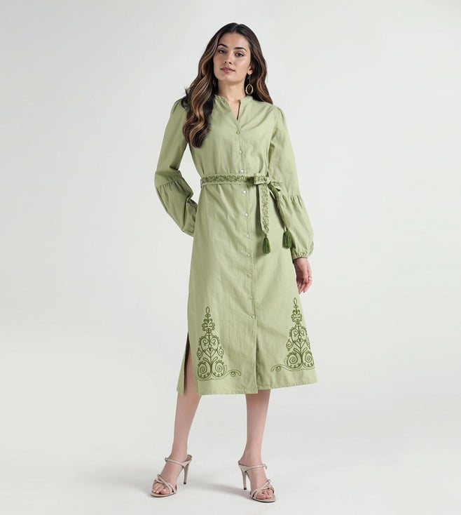 A band collar with button front adds structure to this olive dress. Fabric is cotton making it breathable and soft for everyday wear. Fit and flare style with calf length keeps it elegant yet casual. Embroidery details lift the solid tone and tie it with the fashion trend. Full sleeves complete the look for seasonal comfort.