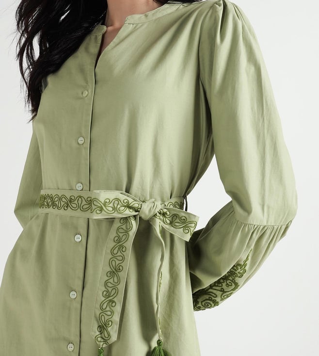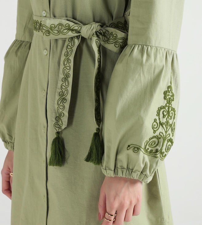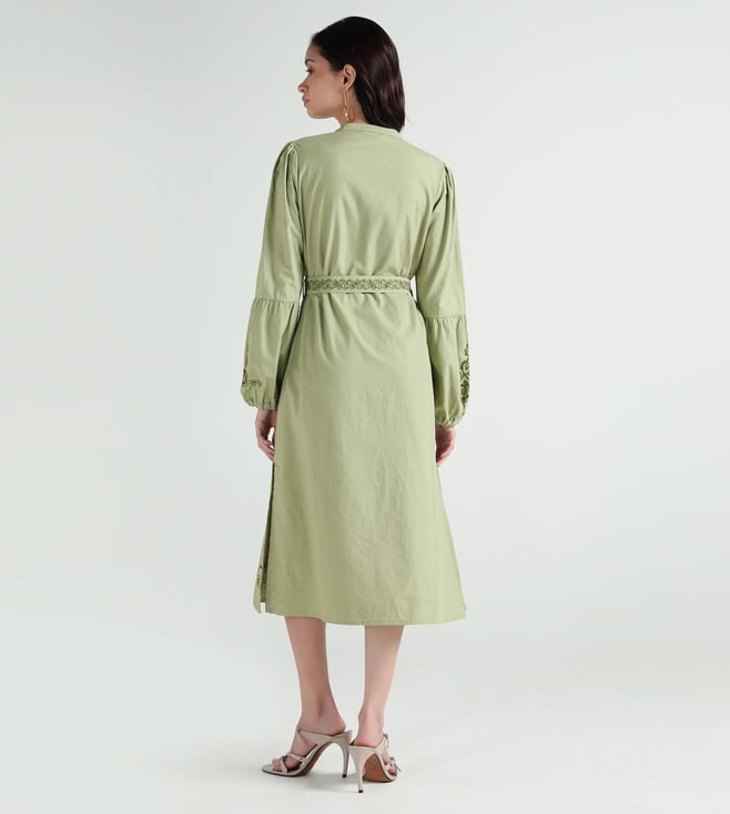Elle Women Olive Embroidered Band Collar Pure Cotton Dress