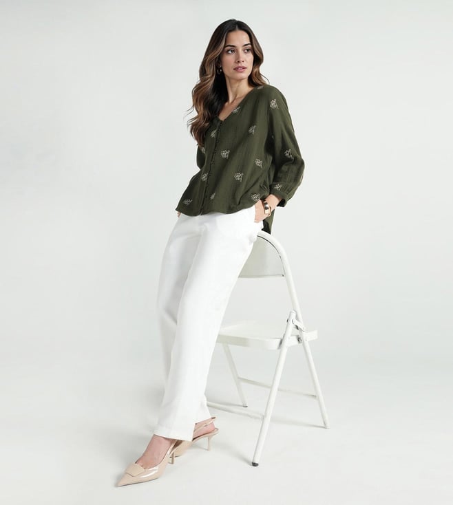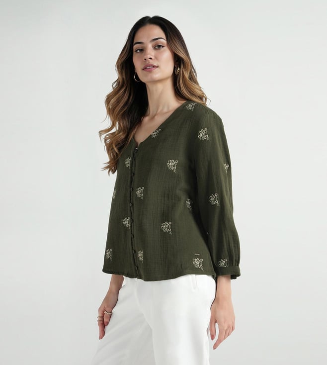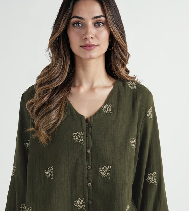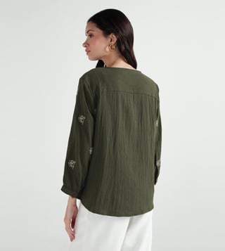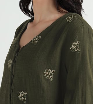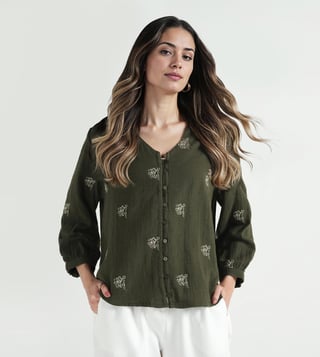 A full sleeve olive top with subtle embroidery that adds texture to a clean solid base. Built in cotton fabric it is breathable and soft making it suitable for casual daily wear. Designed with a V-neckline & button closure the style stays simple yet stylish. It's a perfect piece to pair with skirts or denims.