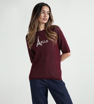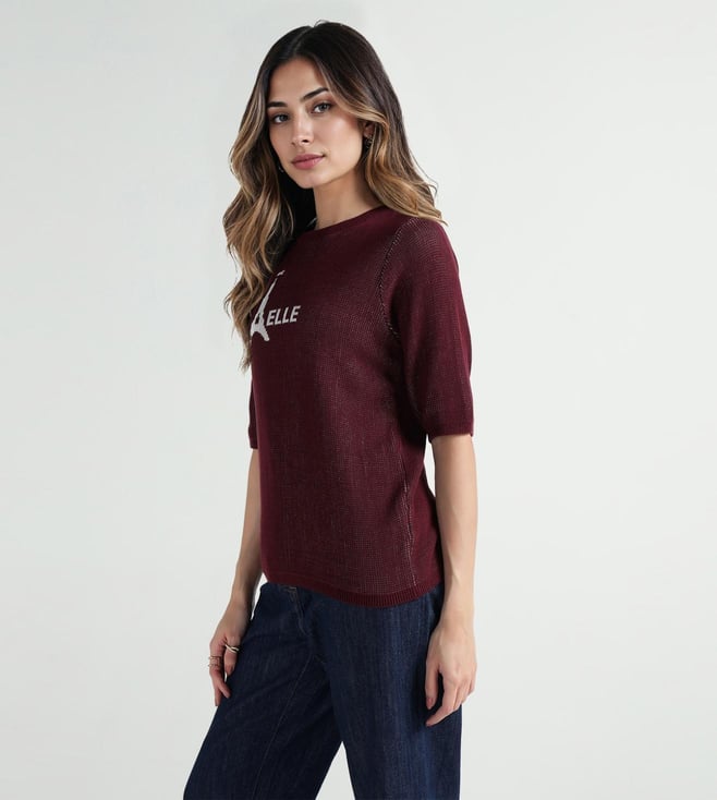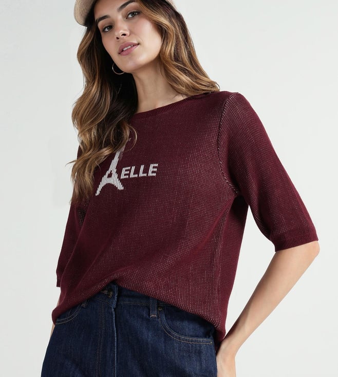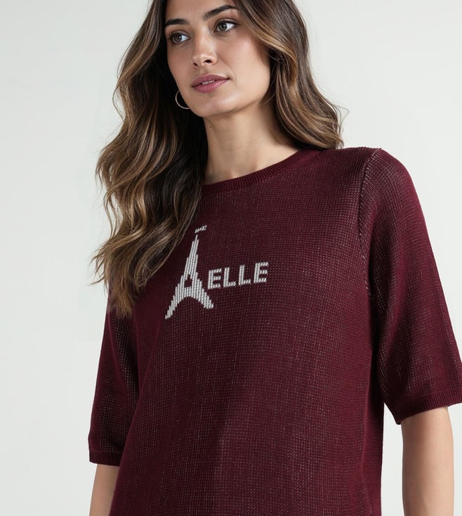 Elle Women Red Textured Round Neck Pure Cotton T-Shirt
