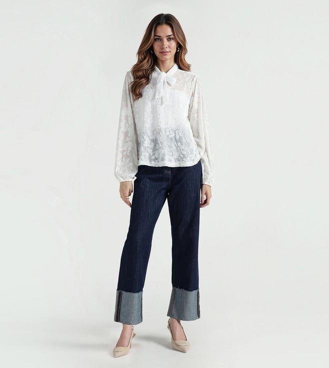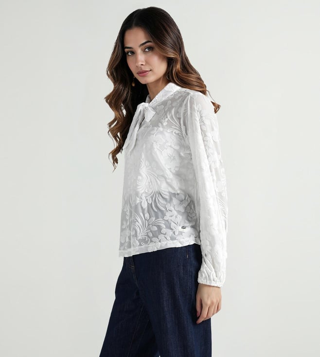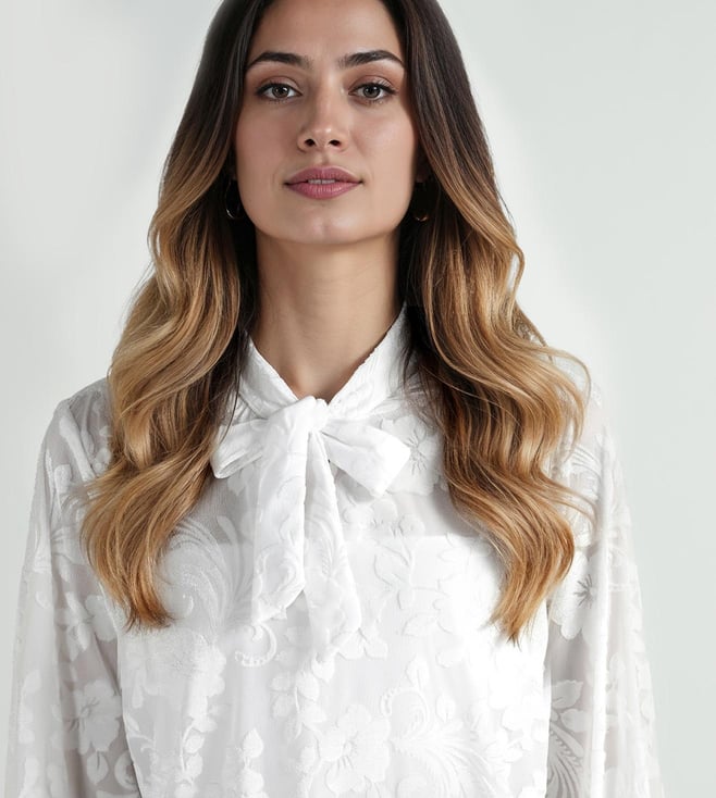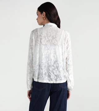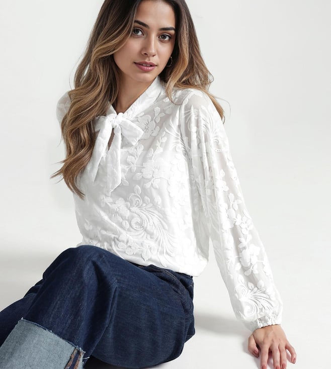 A party-ready white polyester top with Elle branding. Designed with puff sleeves, a round neckline, & a tie-up front keyhole detail. It is a perfect balance of elegance with simplicity. The floral touch adds freshness while the fabric feels smooth against the skin. A wardrobe essential for women who prefer subtle yet stylish dressing.