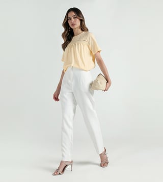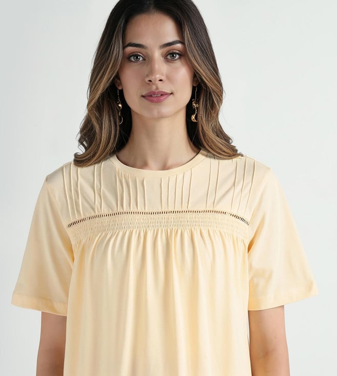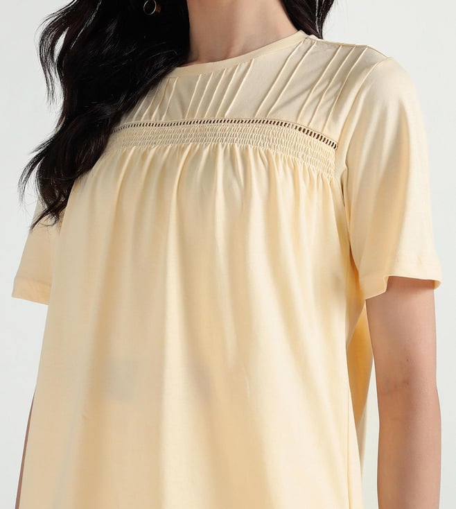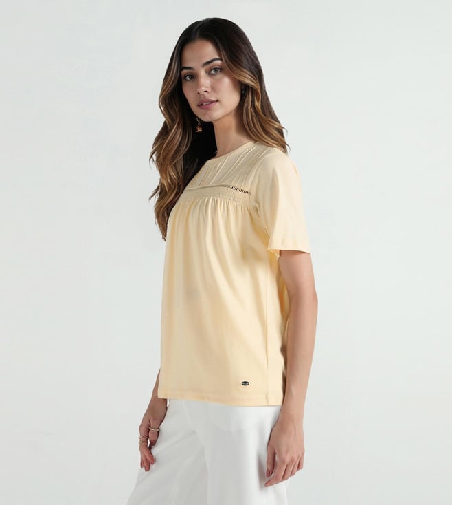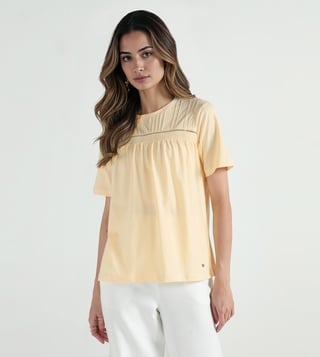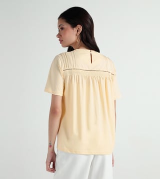 Soft cotton fabric gives this tee a light and easy feel. The round crew neck with half sleeves keeps it simple for daily wear. A regular fit allows comfort while lace insert detail breaks the plain look. Solid yellow tone stays on-trend & works well with jeans or skirts for a casual outfit.