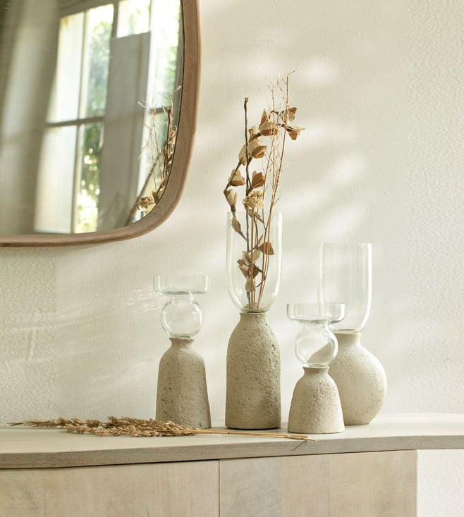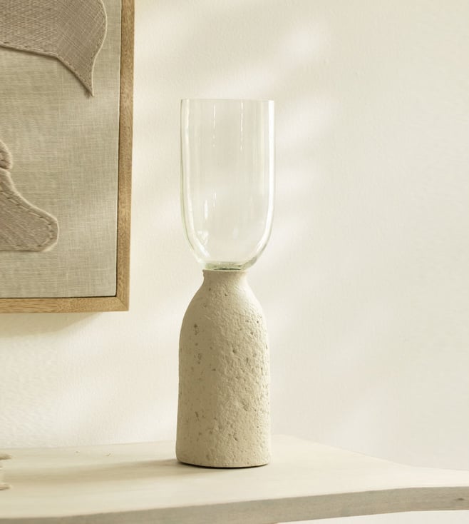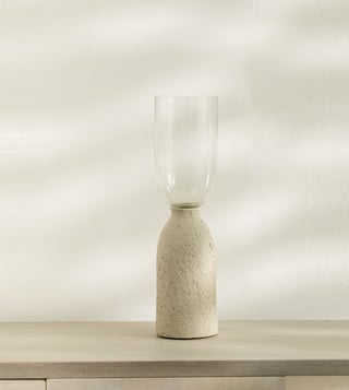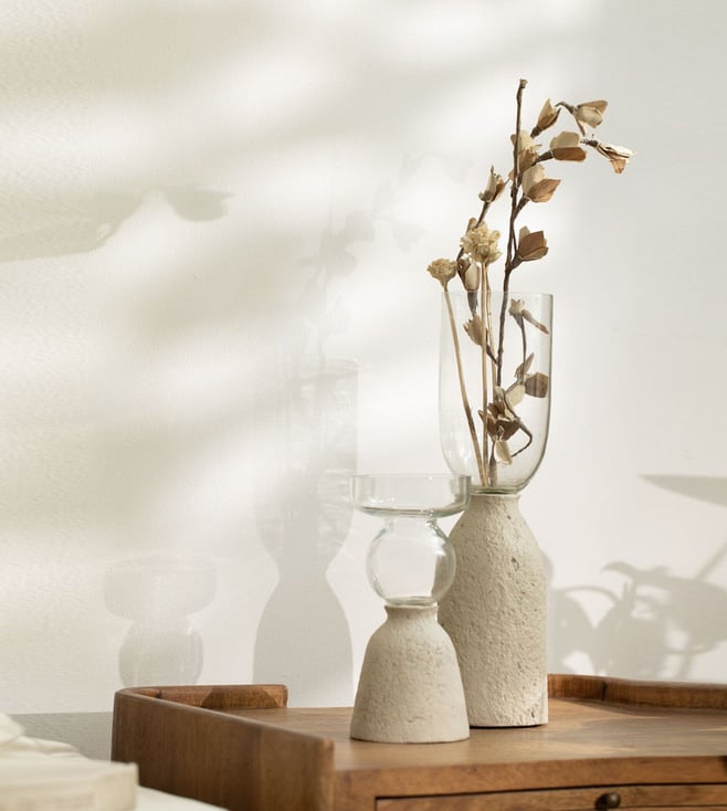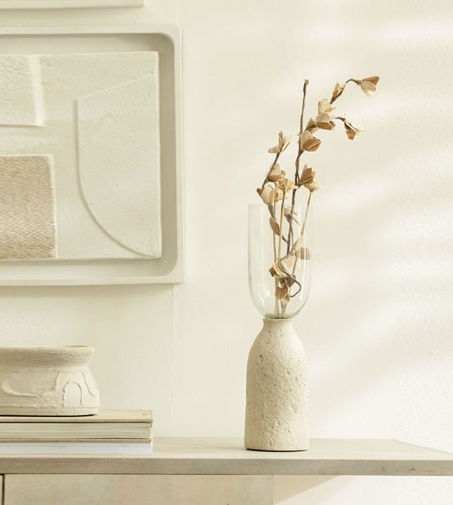 This minimalist flower vase is a tasteful tableware choice. The eggshell ecomix and glass combination effortlessly goes well with different themes. You can place a variety of dried floral arrangements and bring colour into your homescape. Refraining from keeping fresh flowers would be best for this vase. Disclaimer: All other items in the image are only for display purposes and will not be a part of the delivery content. Product colour may slightly vary due to photographic lighting sources. Country of Origin - India.