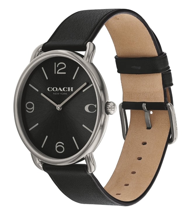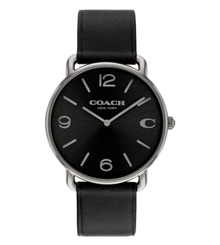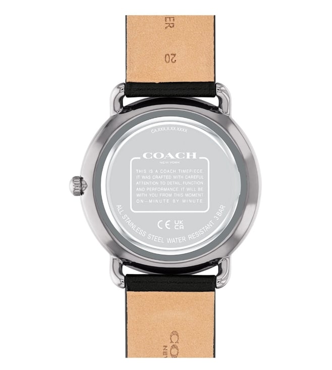 Add a stylish dimension to your look by wearing this men watch from the elliot collection by Coach. The black round dial is nestled by a mineral glass. It vaunts analog and a crown for time adjustment. The leather strap exudes a black hue that accentuates the look of the timepiece.