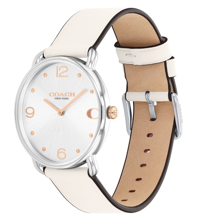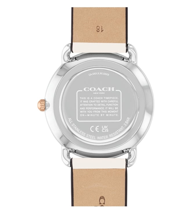 Look modish by donning this women watch from the elliot collection by Coach. The silver round dial is secured by a mineral glass. It displays analog, and a crown for time adjustment. The leather strap showcases a white hue that uplifts the look of the timepiece.