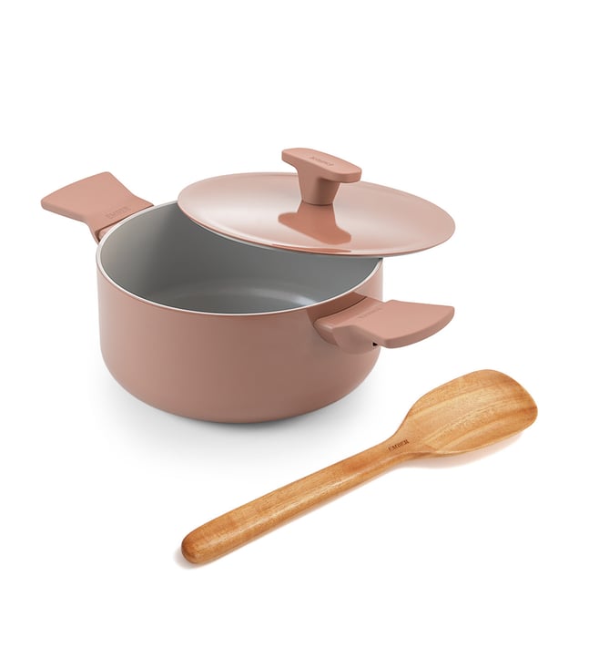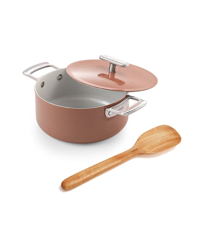 Ember Terracotta Ceramic Non-Stick Kadai - Stainless Steel handle Metallic Lid & Spatula