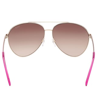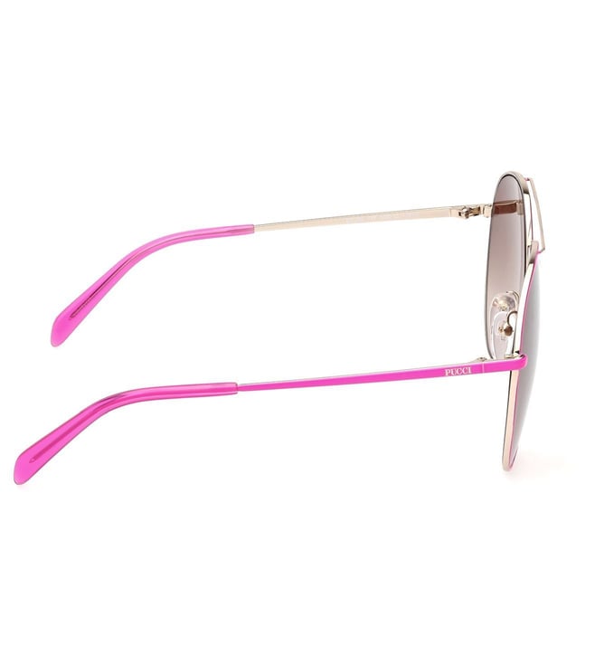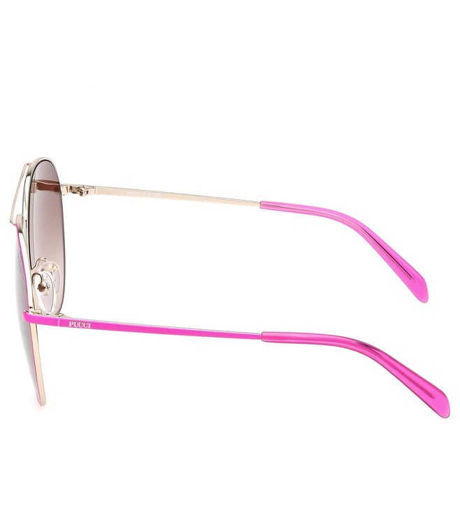 Look like a style icon wearing this pair of Sunglasses from EMILIO PUCCI. The Brown colored lenses are crafted using Plastic that ensures complete protection of your eyes without compromising on style. Prepared with care using premium quality Metal, the Pink-tone frame is very light in weight and long-lasting. Besides, the Full Rim design adds to its look.