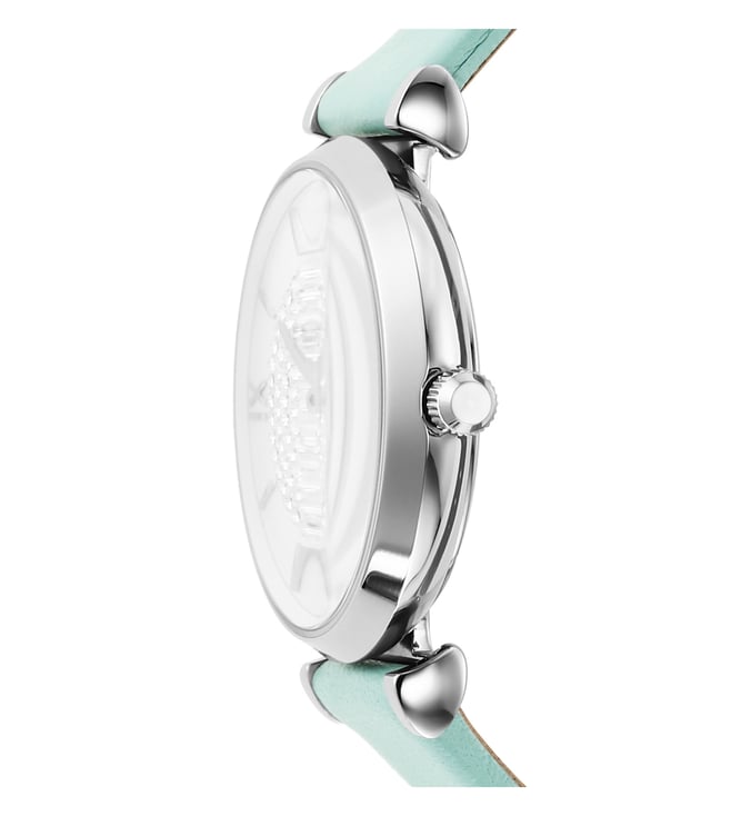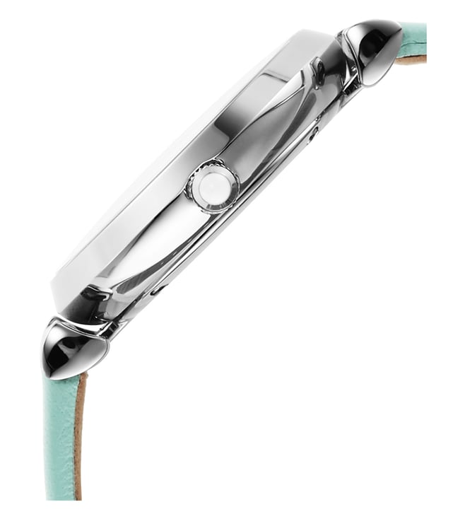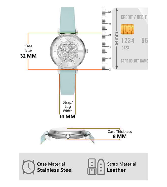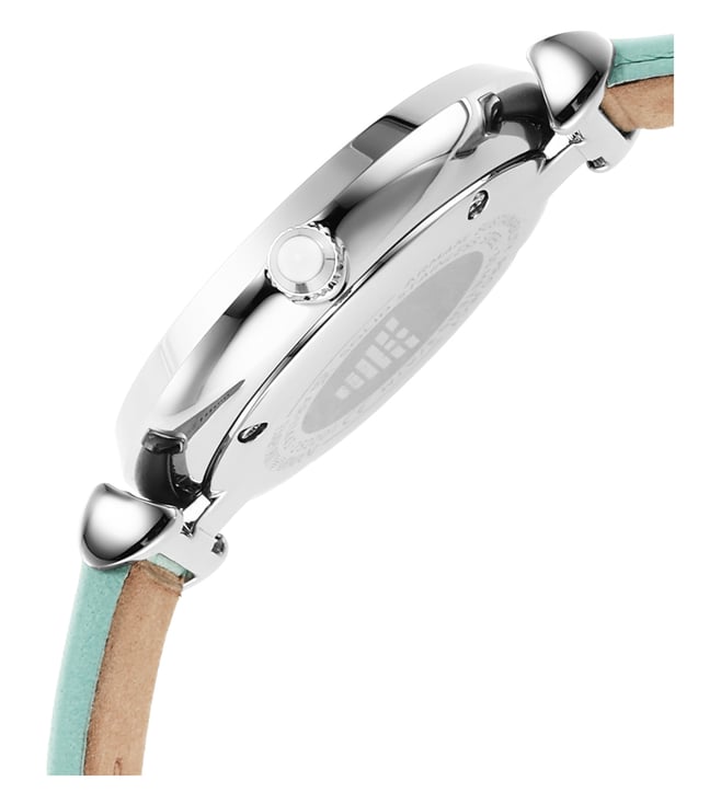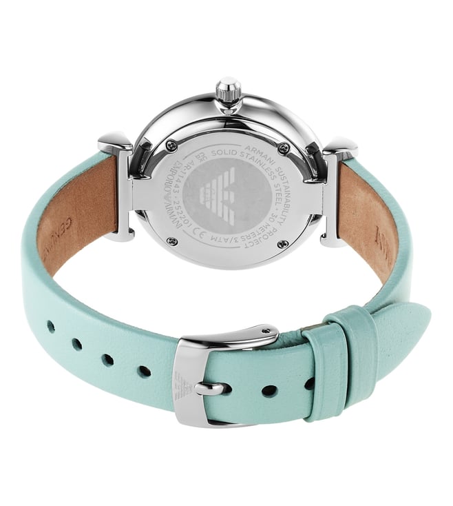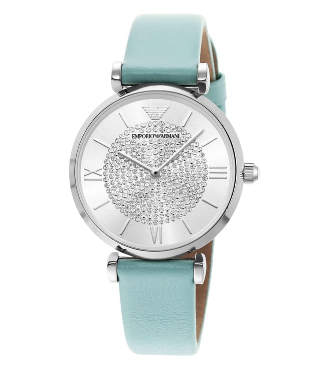 Amaze everyone around you by wearing this women's analog watch from Emporio Armani. The silver round dial is protected by a mineral glass. It features plain 2-hand, and a crown for time adjustment. The strap comes in a blue hue that further elevates the look of the timekeeper. Besides, it is completed with a buckle clasp to ensure a secure fit on the wrist.