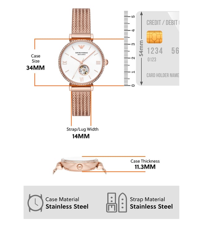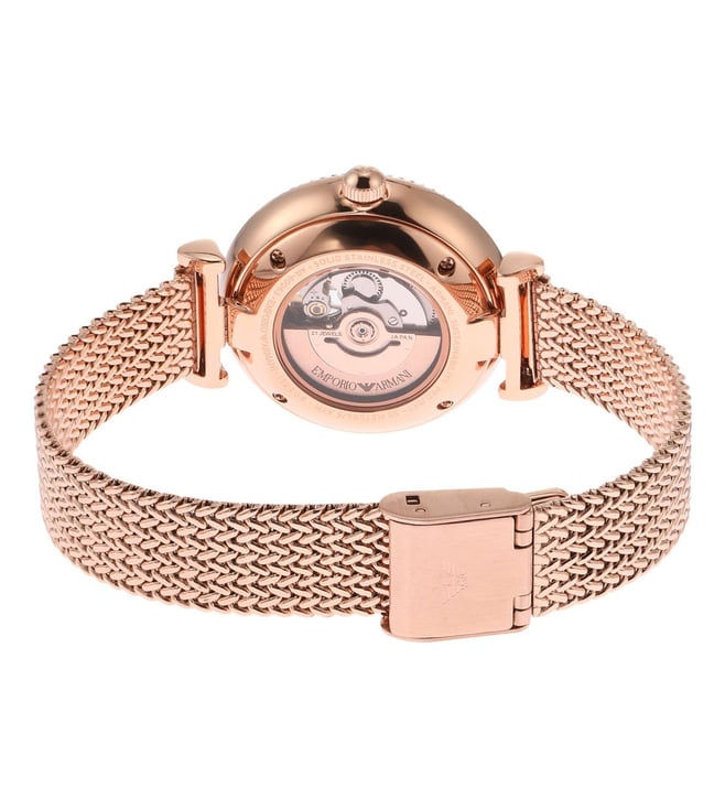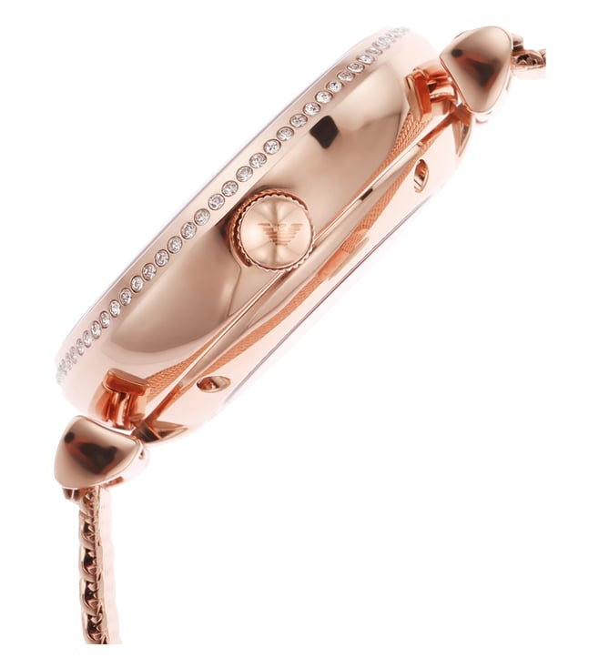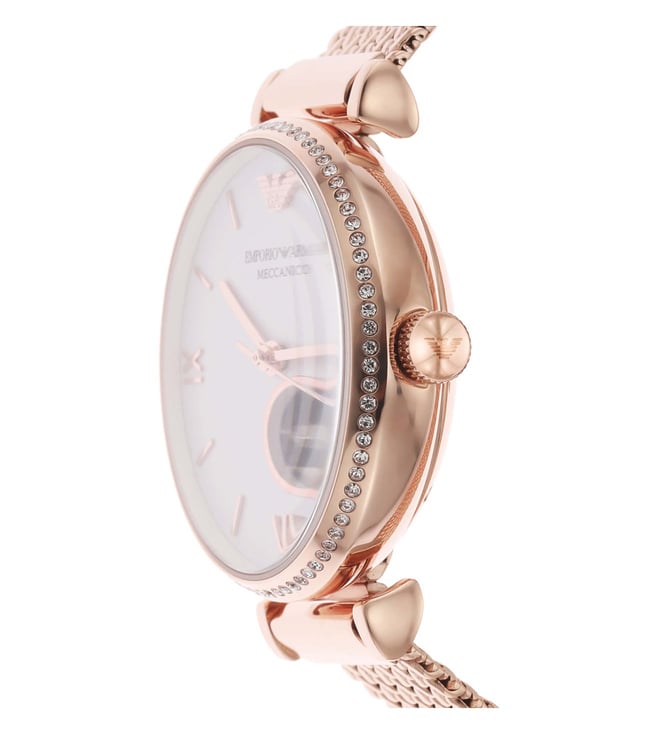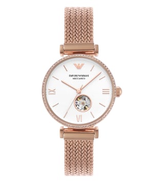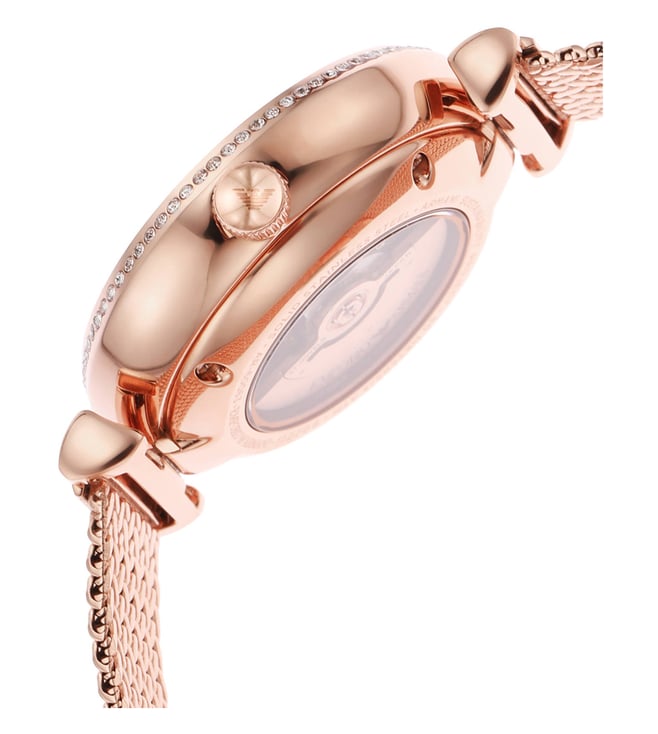 Add a stylish dimension to your look by wearing this women's analog watch from Emporio Armani. Covered by a mineral glass, the white round dial is nestled in a case. It vaunts plain 3-hand, and a crown for time adjustment. The strap exudes a rose gold hue that accentuates the look of the timepiece. Moreover, it is fitted with a deployment clasp clasp that ensures a secure fit on the wrist.