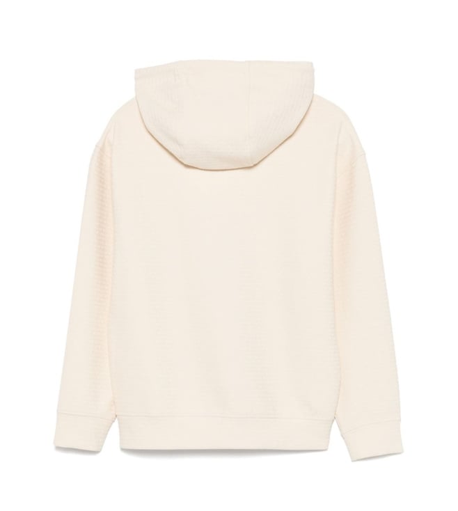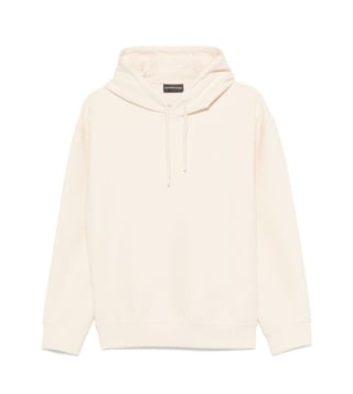 Elevate your style with the Emporio Armani Off White Hoodie. Drawstring hood long sleeves ribbed cuffs and hem pullover.