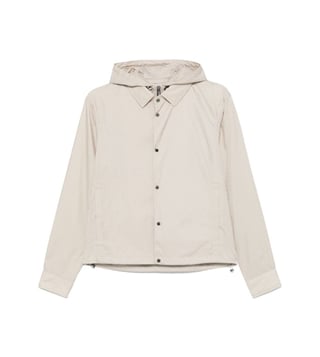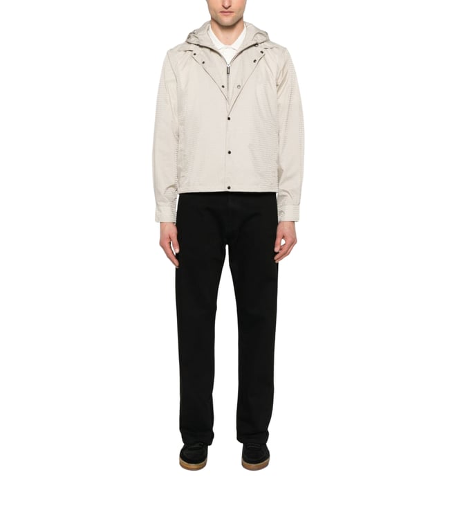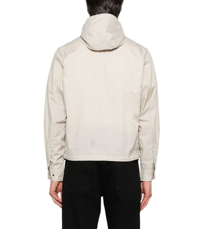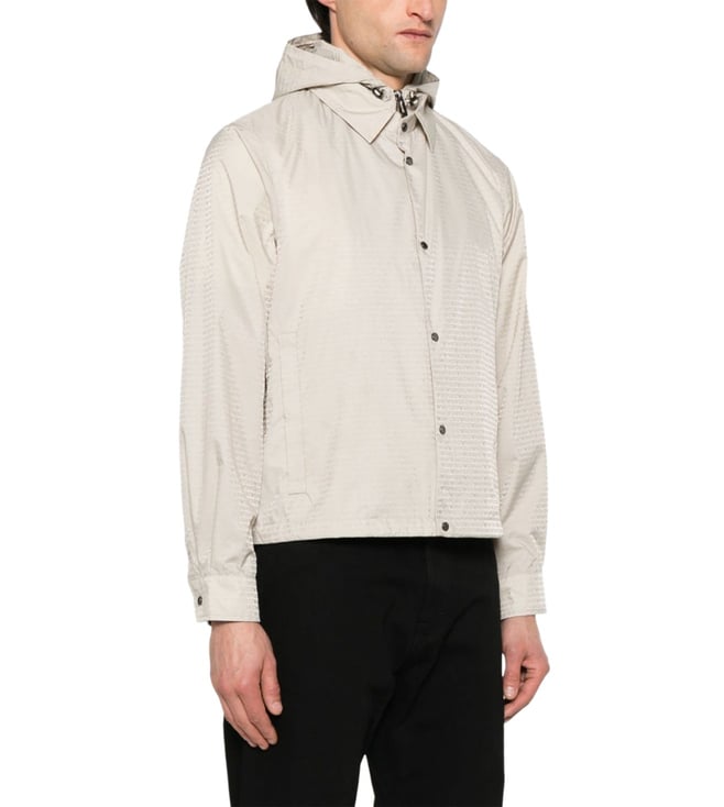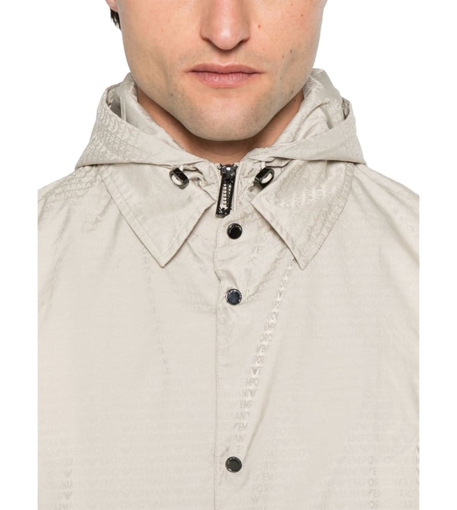 Elevate your style with the Emporio Armani Beige Regular Fit Jacket. Pressstud fastening concealed front zip fastening detachable drawstring hood two front welt pockets this piece fits true to size. recommend you get your regular size model is 1,84m / 6ft 1in wearing size 48 (it).