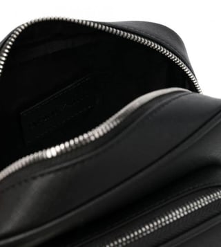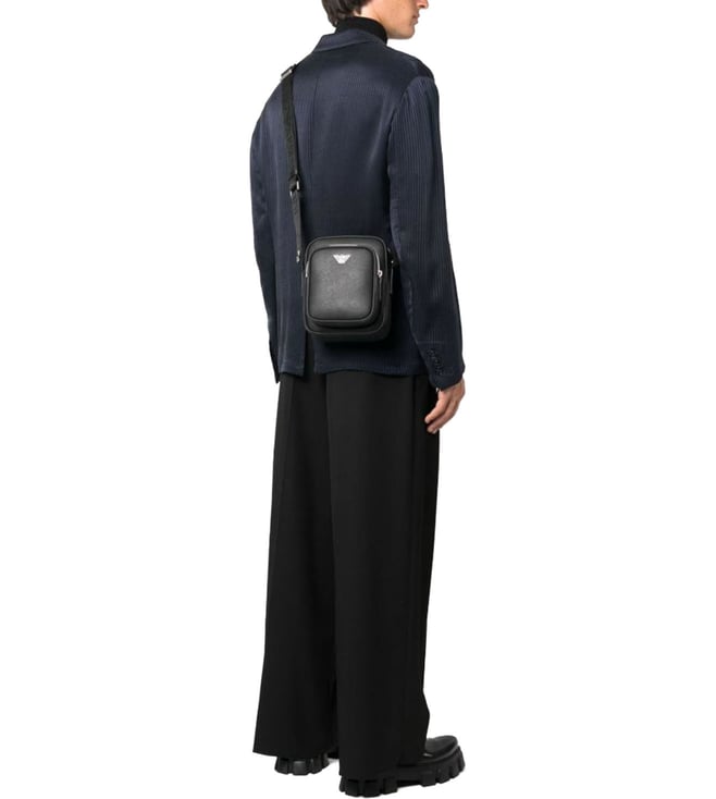 Logo-plaque leather messenger bag from emporio armani featuring black, leather, logo plaque, top zip fastening, adjustable shoulder strap, front zip-fastening pouch pocket and main compartment.
