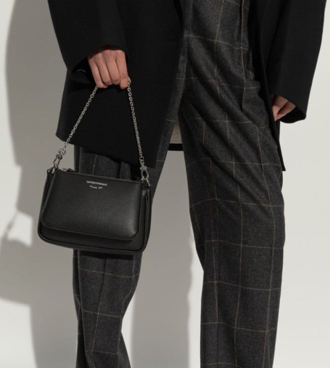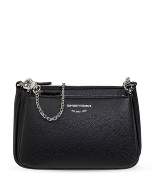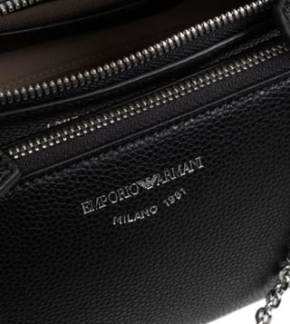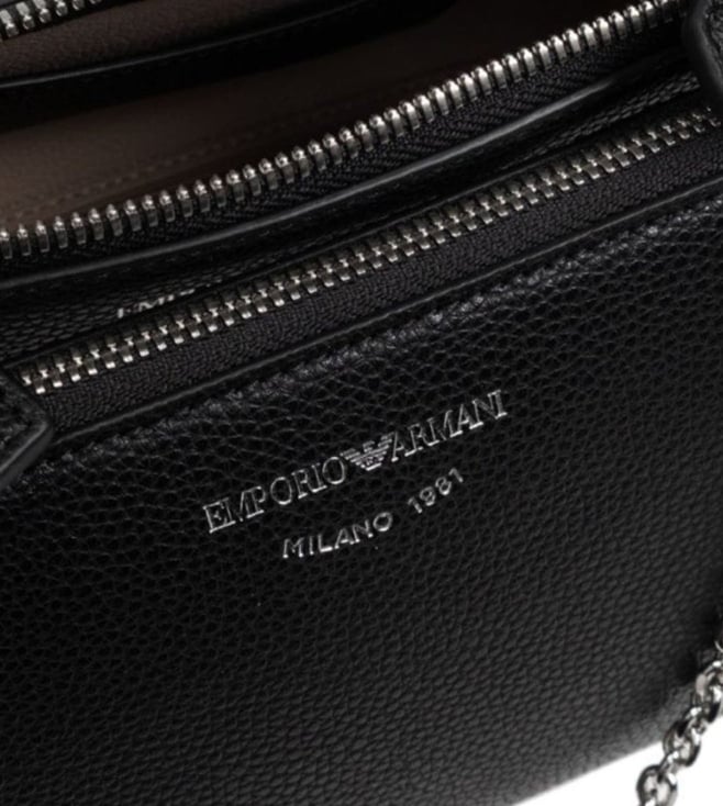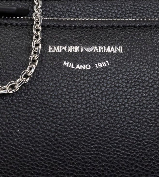 Expand the collection of your accessories in a trendy way with this bag from Emporio Armani. Thermoplastic resin 100 percentblack faux leathergrainy texturezipper at the topchain handleremovable shoulder strapzippered pocketlogo print on the frontinside pockets