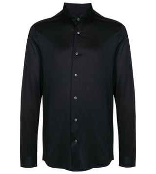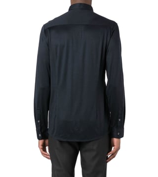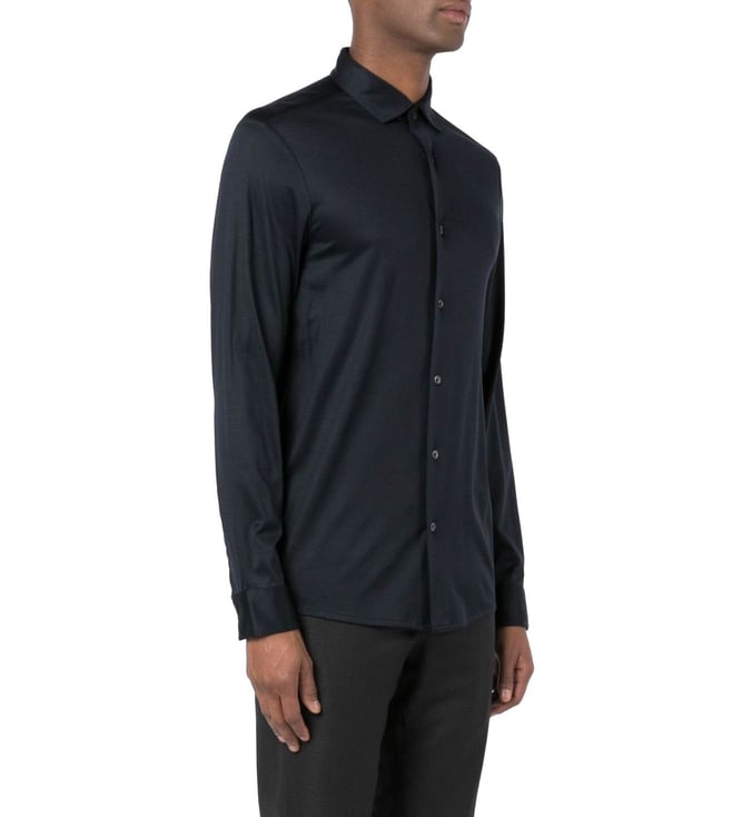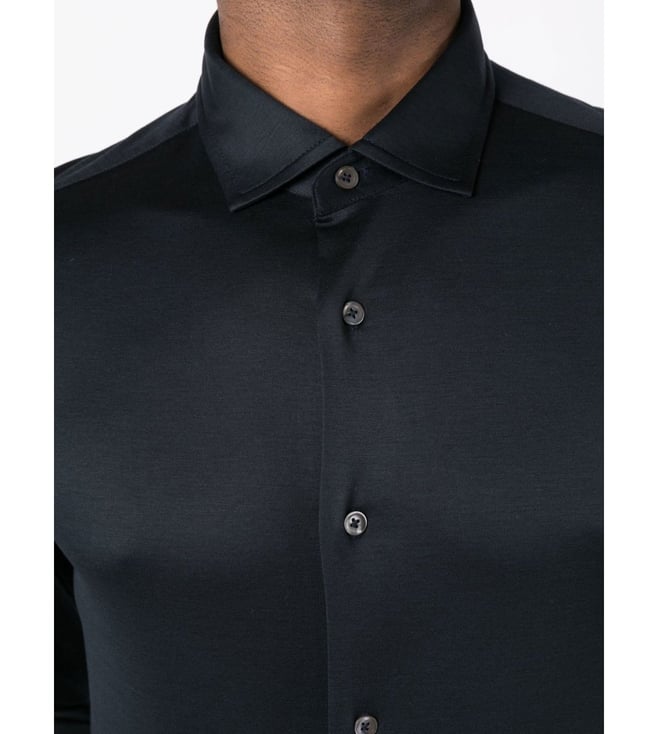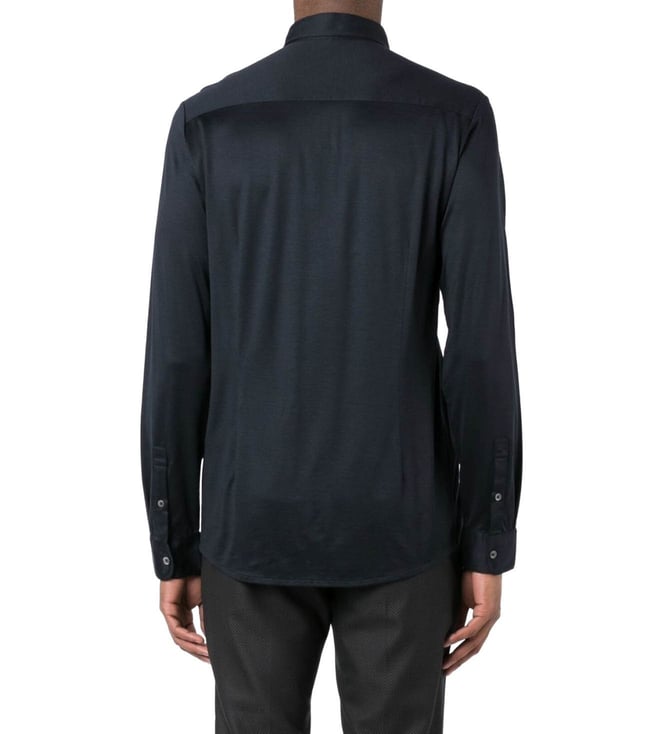 Elevate your style with the Emporio Armani Black Regular Fit shirt. Longsleeve poplin shirt from Emporio Armani featuring navy blue, cottonlyocell blend, straightpoint collar, front button fastening, long sleeves, buttoned cuffs and curved hem. This piece fits true to size. recommend you get your regular size model is 1,84m / 6ft 1in wearing size m.