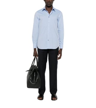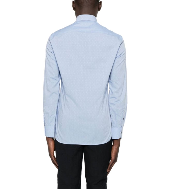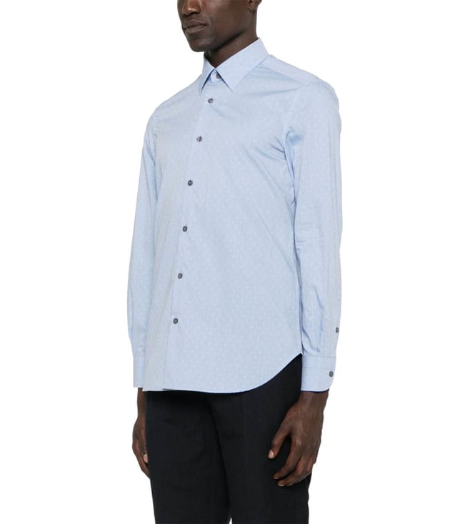 Elevate your style with the Emporio Armani Blue Printed Regular Fit Shirt. Front button fastening buttoned cuffs cutaway collar long sleeves this piece fits true to size. recommend you get your regular size model is 1,84m / 6ft 1in wearing size m.