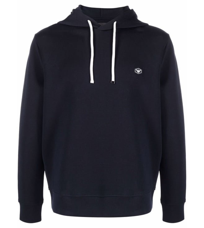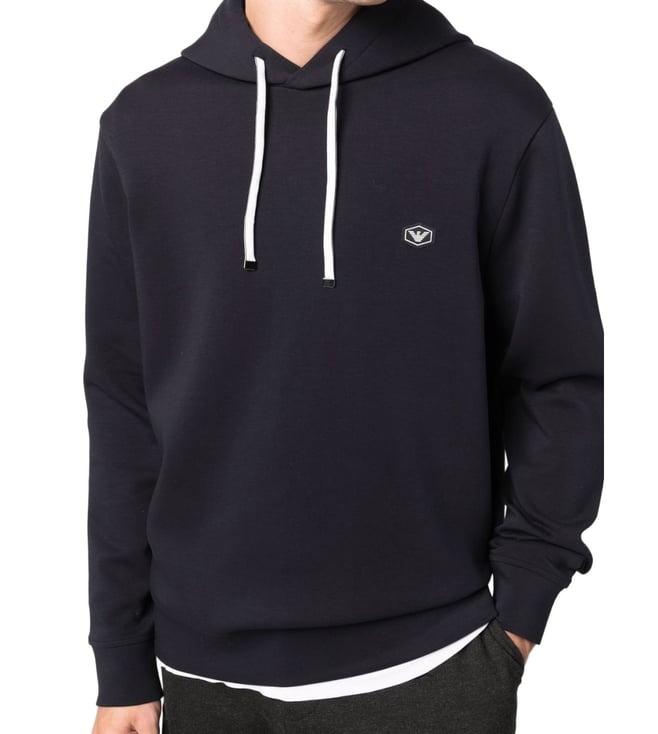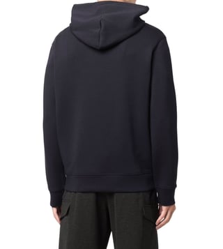 Elevate your style with the Emporio Armani Black Regular Fit Hoodie. Navy cottonblend longsleeved logo patch hoodie from emporio armani featuring ribbed detailing, logo patch at the chest, drawstring hood and long sleeves. This piece fits true to size. recommend you get your regular size model is 1,84m / 6ft 1in wearing size m.