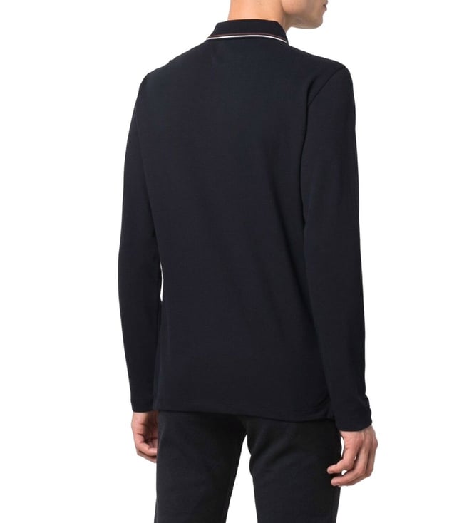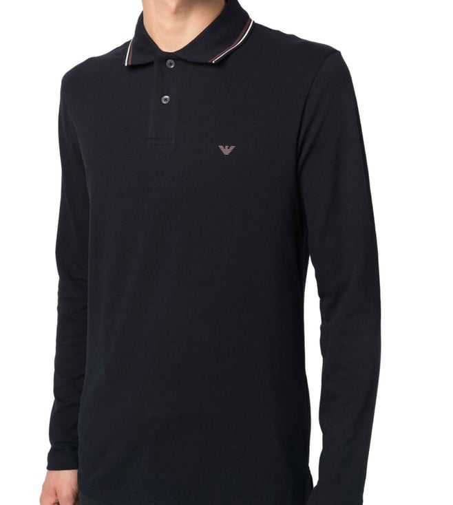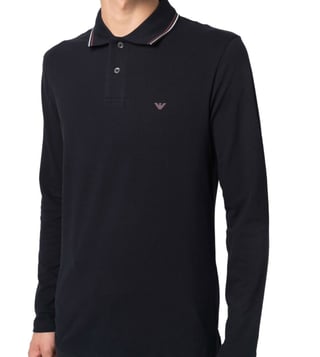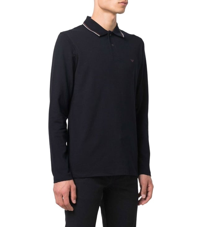 Elevate your style with the Emporio Armani Navy Embroidered Logo Regular Fit polo t-shirt. Navy blue cotton blend longsleeved logoprint polo shirt from emporio armani featuring logo print at the chest, polo collar, long sleeves and straight hem. This piece fits true to size. recommend you get your regular size model is 1,84m / 6ft 1in wearing size m.