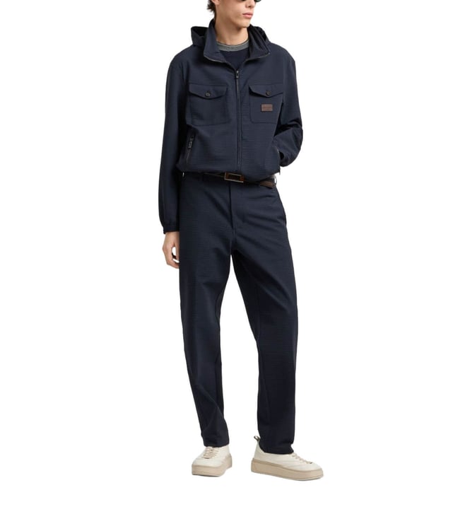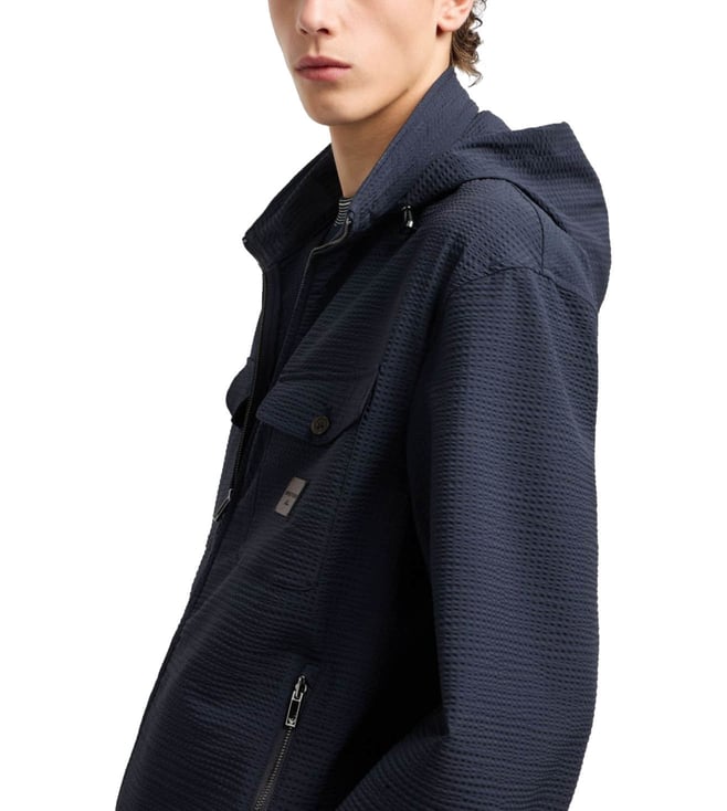Elevate your style with the Emporio Armani Navy Blue Blouson Jacket. Darkblue textured weave zip fastening flap pockets hooded neckline branded patch.