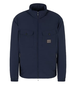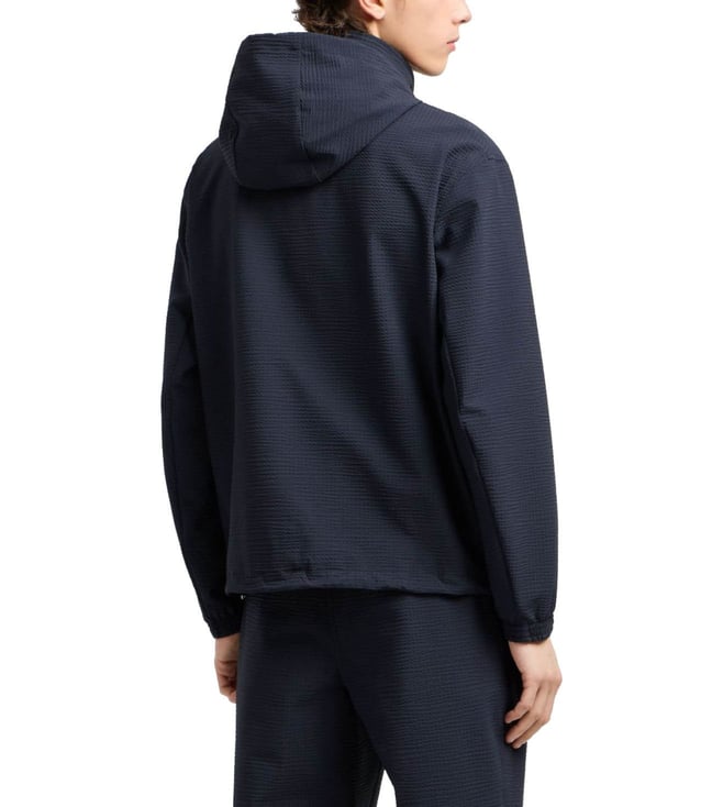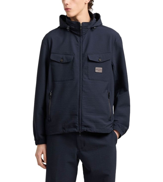 Elevate your style with the Emporio Armani Navy Blue Blouson Jacket. Darkblue textured weave zip fastening flap pockets hooded neckline branded patch.