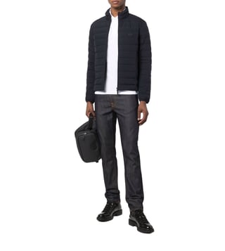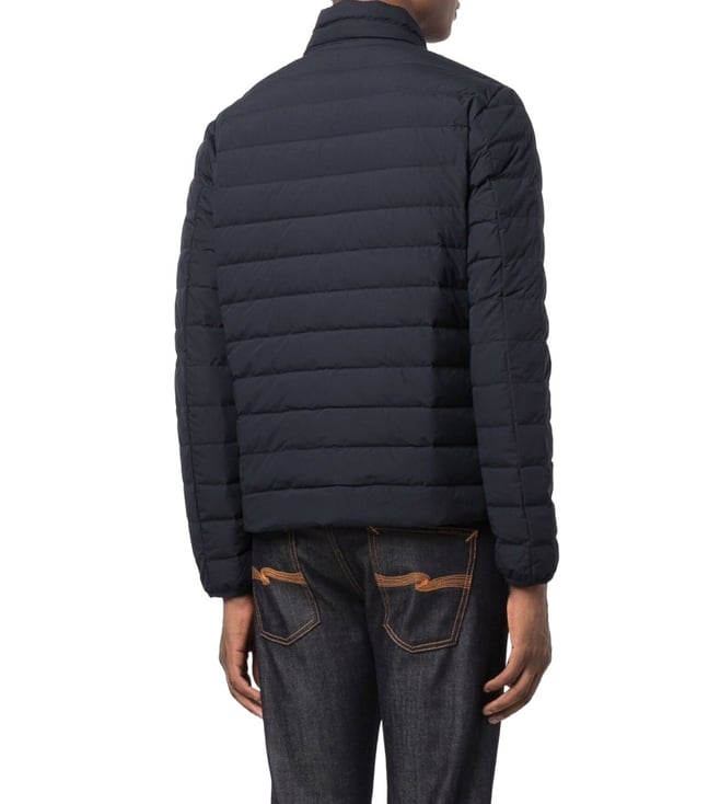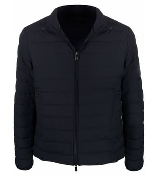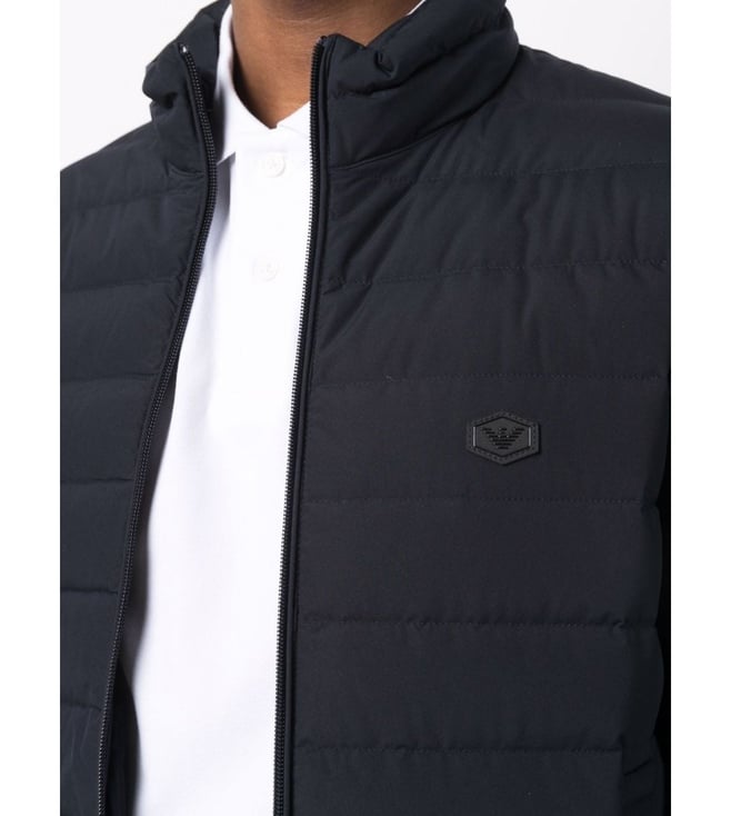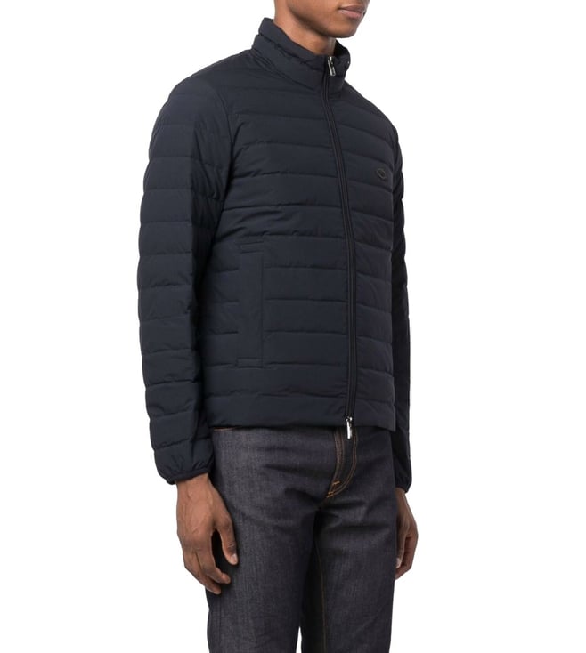 Elevate your style with the Emporio Armani Black Regular Fit Puffer Jacket. Navy blue down logopatch jacket from emporio armani featuring design, logo patch to the side, front zip fastening, long sleeves and high neck. This piece fits true to size. recommend you get your regular size model is 1,84m / 6ft 1in wearing size 48 (it).
