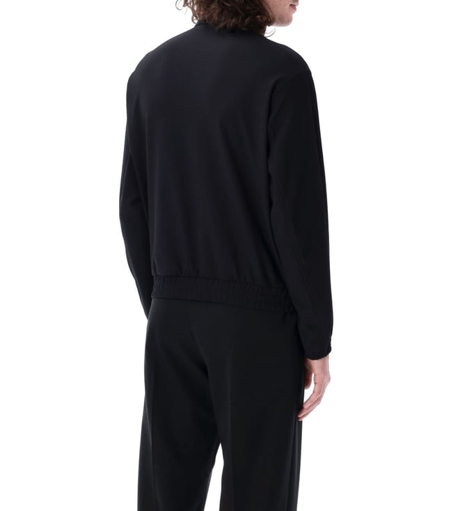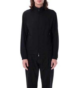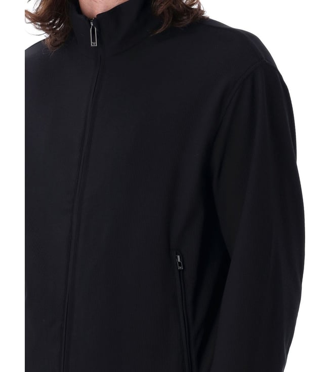 Elevate your style with the Emporio Armani Black Blouson Jacket. Standup collar. Fullzip fastening. Weave. Long sleeves. Side zip pockets. Stretch cuffs and hem.