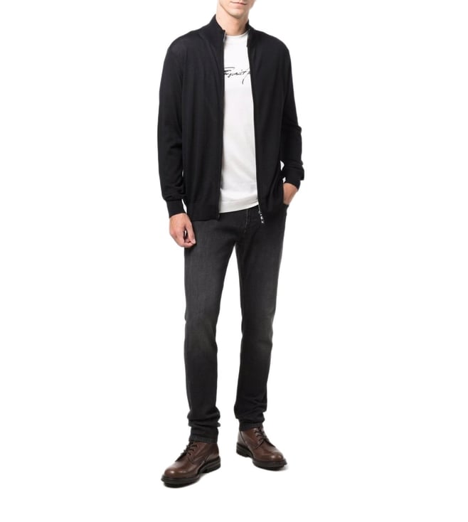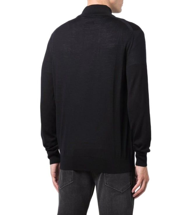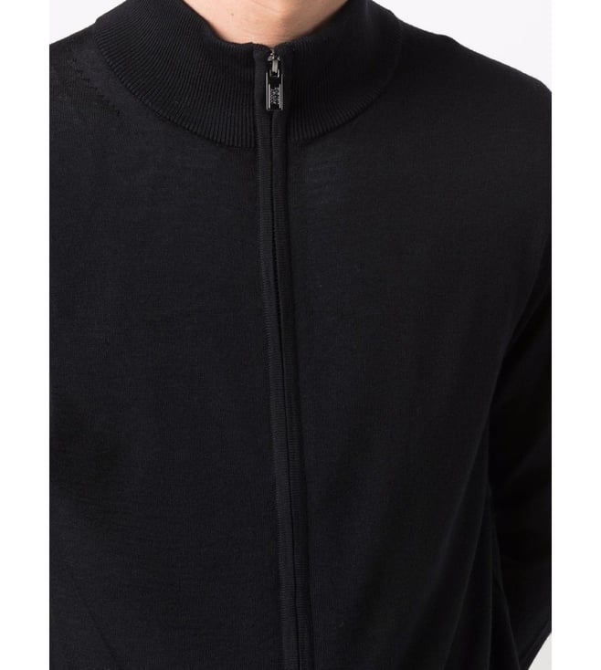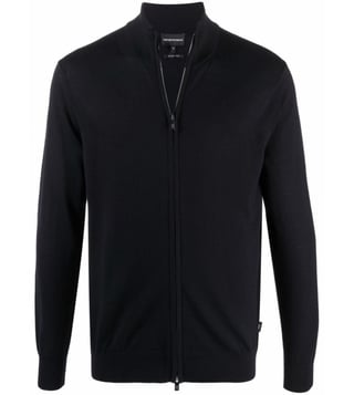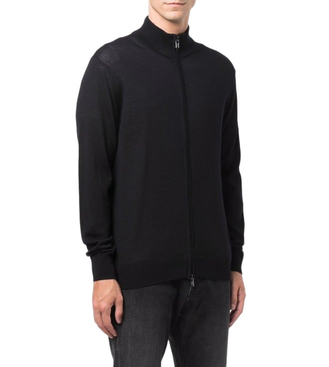 Elevate your style with the Emporio Armani Black Zipped Regular Fit Cardigan. Navyblue wool zipup knitted jumper from emporio armani featuring fine knit, high neck, front zip fastening and long sleeves. This piece fits true to size. recommend you get your regular size model is 1,84m / 6ft 1in wearing size m.