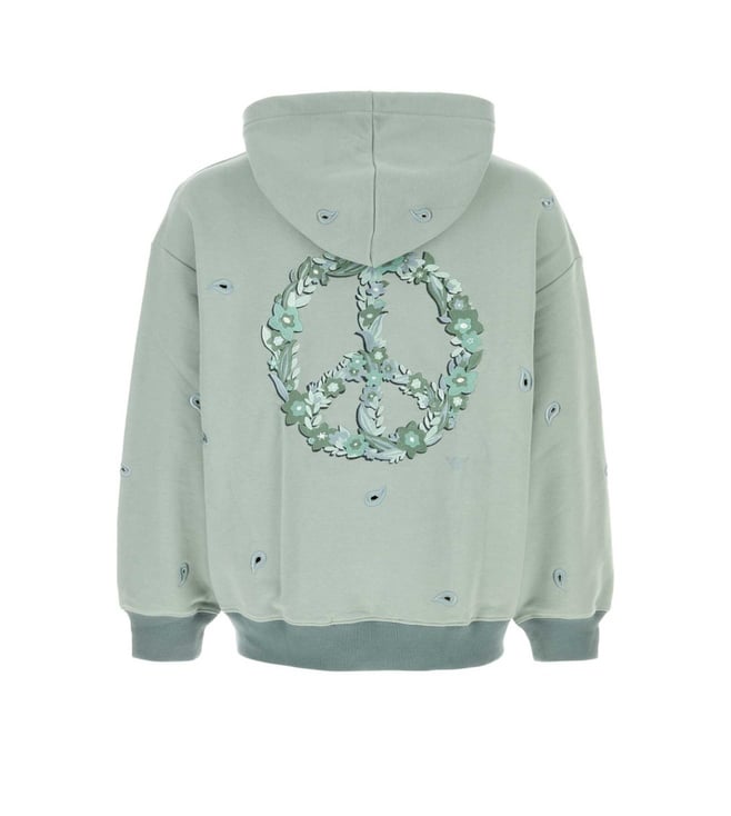 Elevate your style with the Emporio Armani Green Paisley Oversized Fit Hoodie. Classic hood drop shoulder ribbed cuffs and hem allover motif embroidery pullover.
