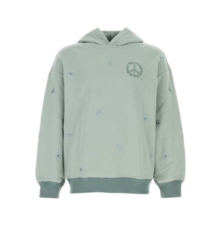 Elevate your style with the Emporio Armani Green Paisley Oversized Fit Hoodie. Classic hood drop shoulder ribbed cuffs and hem allover motif embroidery pullover.