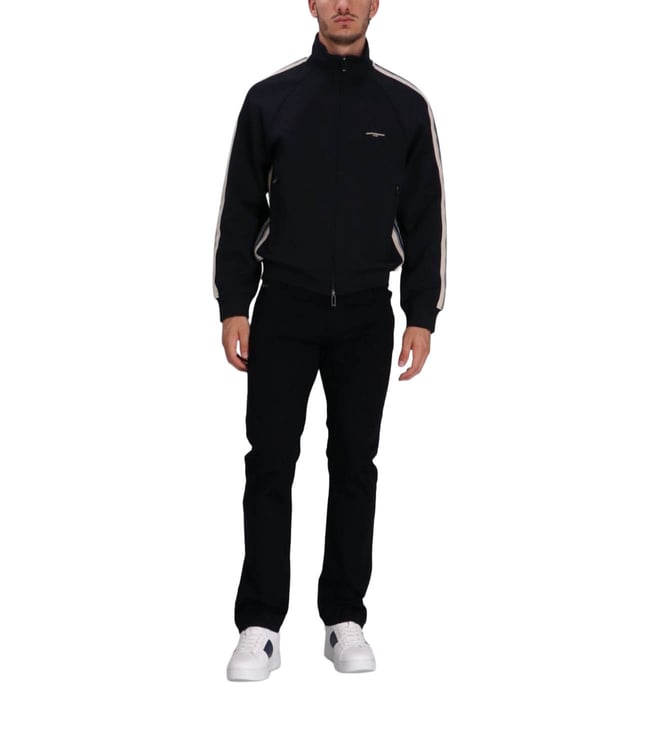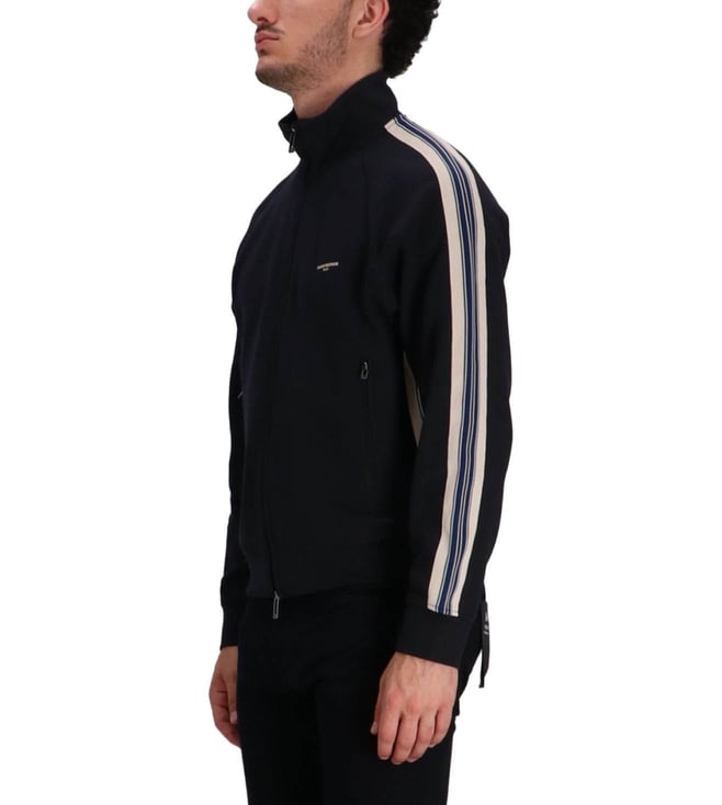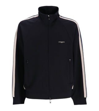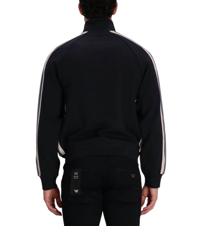 Elevate your style with the Emporio Armani Navy Zipped Sweatshirt. Navy blue front zip fastening high neck long sleeves side stripe detail logo cotton zipped sweatshirt. . Products purchased from Darveys are supported exclusively by the warranty/exchange policies of Darveys and its partner boutiques. Brand owners and their channel partners are not responsible for exchange/warranty services for items purchased through Darveys.